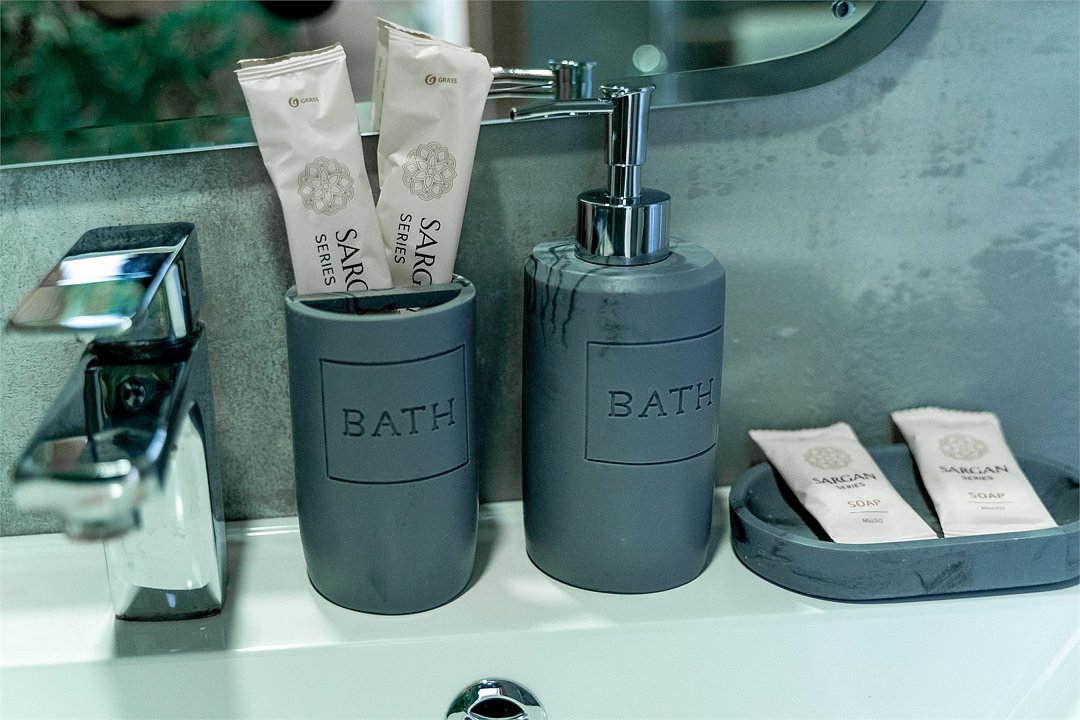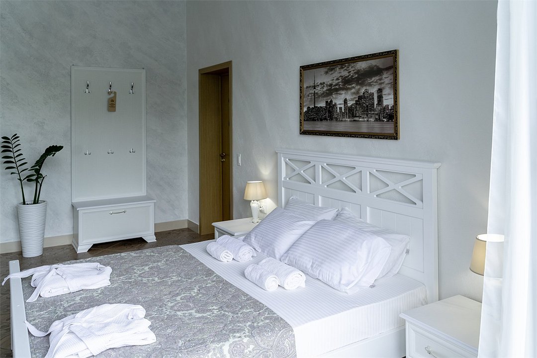 Wi-Fi, кондиционер, светильник, настольные лампы, фен, ванная комната, ванна, халаты, тапочки, гигиенические средства, двуспальная кровать, тумбы, стулья, шкаф для одежды, зеркало, пуфики, письменные принадлежности, унитаз, раковина, косметическое зеркало, отопление, кулер на этаже, плиточное покрытие, высокие потолки, стаканы, стол, туалетный столик, туалетные средства, туалет, телевизор с плоским экраном, мини-холодильник, москитная сетка, телевизор со Smart TV, вешалки-плечики, бутилированная водаВ номере