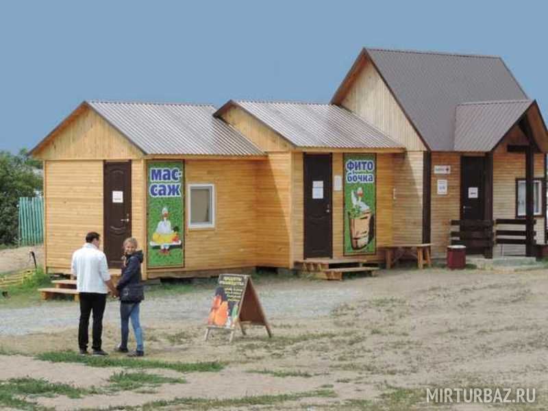 Вся территория комплекса освещена и охраняется. К услугам отдыхающих удобные летние домики трёх типов (см. раздел «Наши услуги»), душевые кабинки, туалеты, русские бани, кафе, магазин, пивной бар, проведен водопровод с артезианской водой, налажена продажа дров, березовых веников и т.д. На нашей базарной площади Вы можете купить фрукты, овощи, продукцию пчеловодства, сувениры, мыло ручной работы с лечебной грязью и фасованную лечебную грязь. Приобрести все необходимое для отдыха от солнечных очков и купальников до тулупов и валенок.