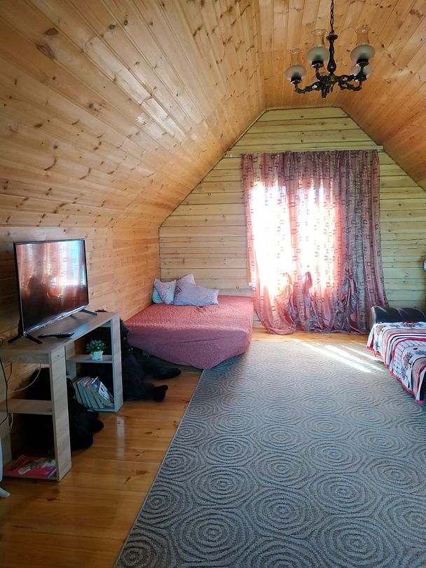 Второй этаж — это настоящий уголок спокойствия и отдыха, где расположены спальные места и небольшой обеденный уголок с холодильником и чайником. Особое очарование этому пространству придает панорамный вид на озеро, открывающийся из окон, где закаты над водой становятся незабываемыми мгновениями, оставляющими след в памяти.