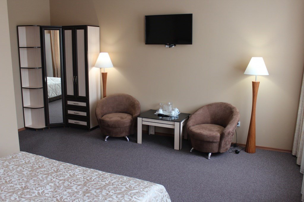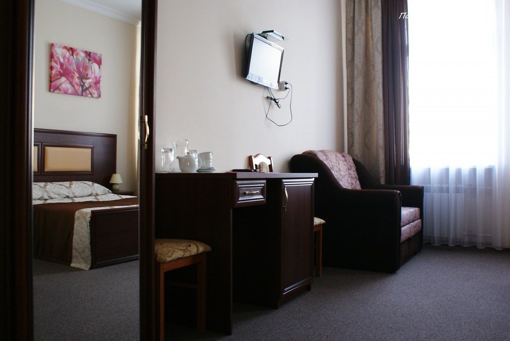 Комфортный номер с кабинетом и с видом на набережную реки Писса расположен в самой тихой зоне гостиницы. Этот просторный номер идеально подойдет для любого человека, который захочет совместить приятное с полезным. (24-34 кв.м.) Двухспальная кровать Wi-Fi Кабинет с рабочей зоной Прихожая Гарнитурная мебель Большой LCD телевизор Телефон Холодильник Чайный набор Душевая кабина с музыкальной душевой Махровые полотенца Махровый халат Одноразовые тапочки Фен Набор личных принадлежностейДвухместный номер первой категории Эконом