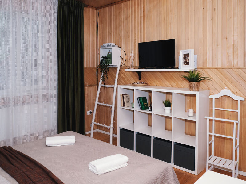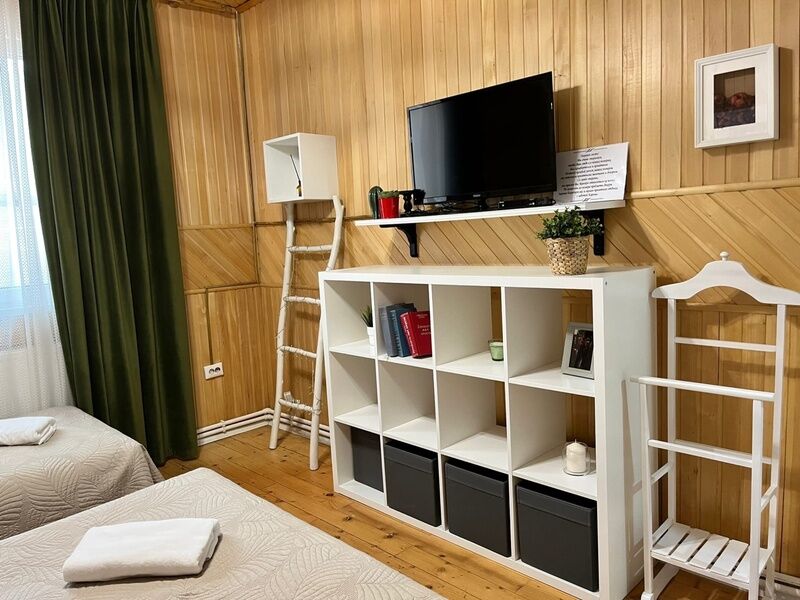 Трехместный номер категории Стандарт. Одна двуспальная и одна односпальная кровати. Отдельный вход с улицы. В номере есть все необходимое для комфортного проживания (постельное, полотенца, гигиенические принадлежности). На каждые 2 номера, на территории есть кухня,