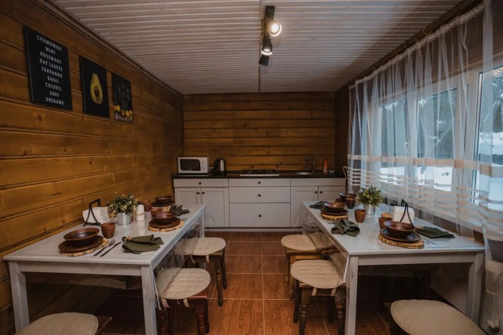 принадлежности). На каждые 2 номера, на территории есть кухня, полностью оборудованная посудой и техникой. Душ, туалет.