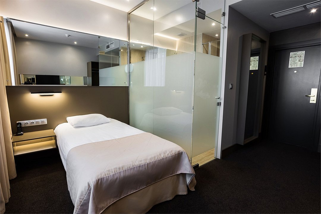 Решение для тех, кто путешествует в одиночку. Кровать с идеальным матрасом обеспечит вам быстрое восстановление сил и подарит отличный сон после активного дня. Стильный и современный дизайн этой категории номеров создает приятную атмосферу для отдыха и работы. Благодаря стеклянной перегородке между комнатой и санузлом, пространство в номере визуально расширяется, придавая ему особый шарм. Площадь: 15 кв.мУслуги и удобства