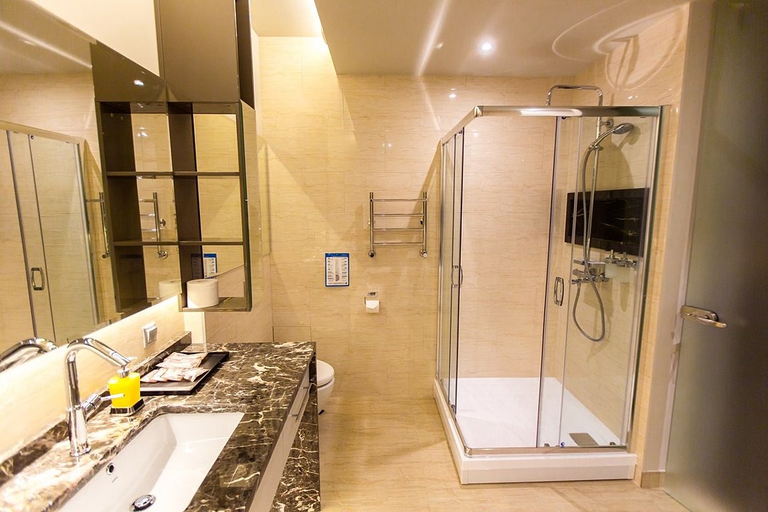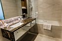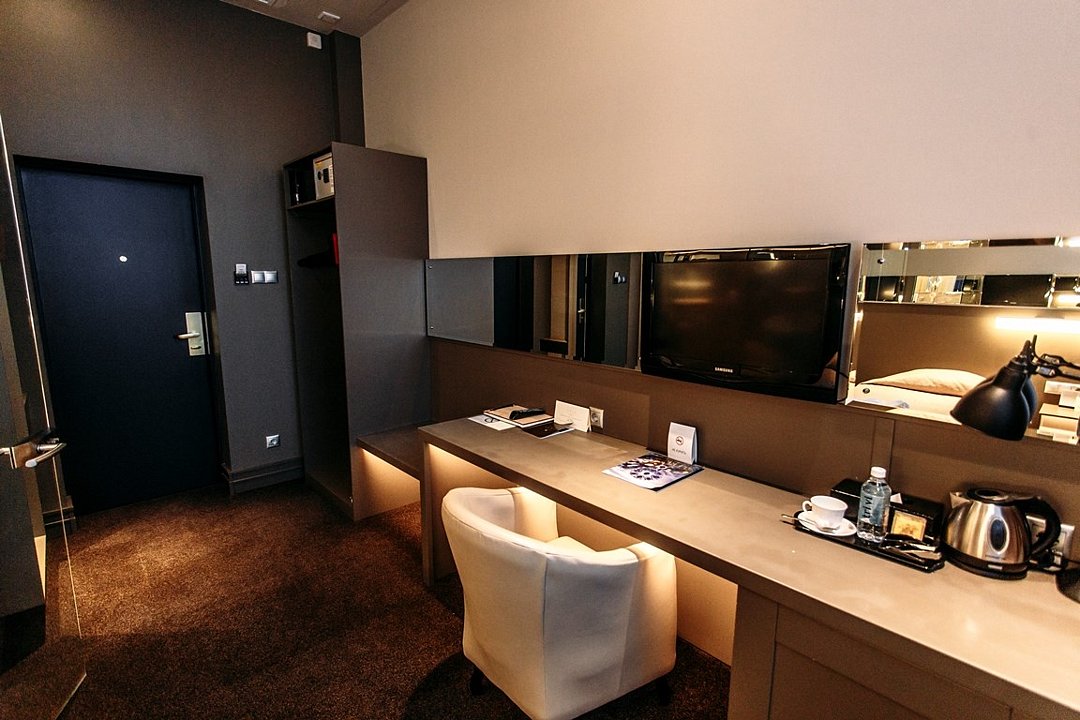 телевизор, Wi-Fi, телефон, кондиционер, система климат-контроля, светильник, фен, ванная комната, душевая кабина, ванна, халаты, банные полотенца, тапочки, гигиенические средства, двуспальная кровать, гладильная доска, тумбы, шкаф для одежды, журнальный столик, зеркало, мини-бар, чайный набор, обслуживание номеров, информационная карта, меню, сейф, чайник, питьевая вода, ковровое покрытие, вид на город, кресло, туалетные средства, мини-холодильник, номер для некурящих, пуфик, рабочий стол, система умный домВ номере