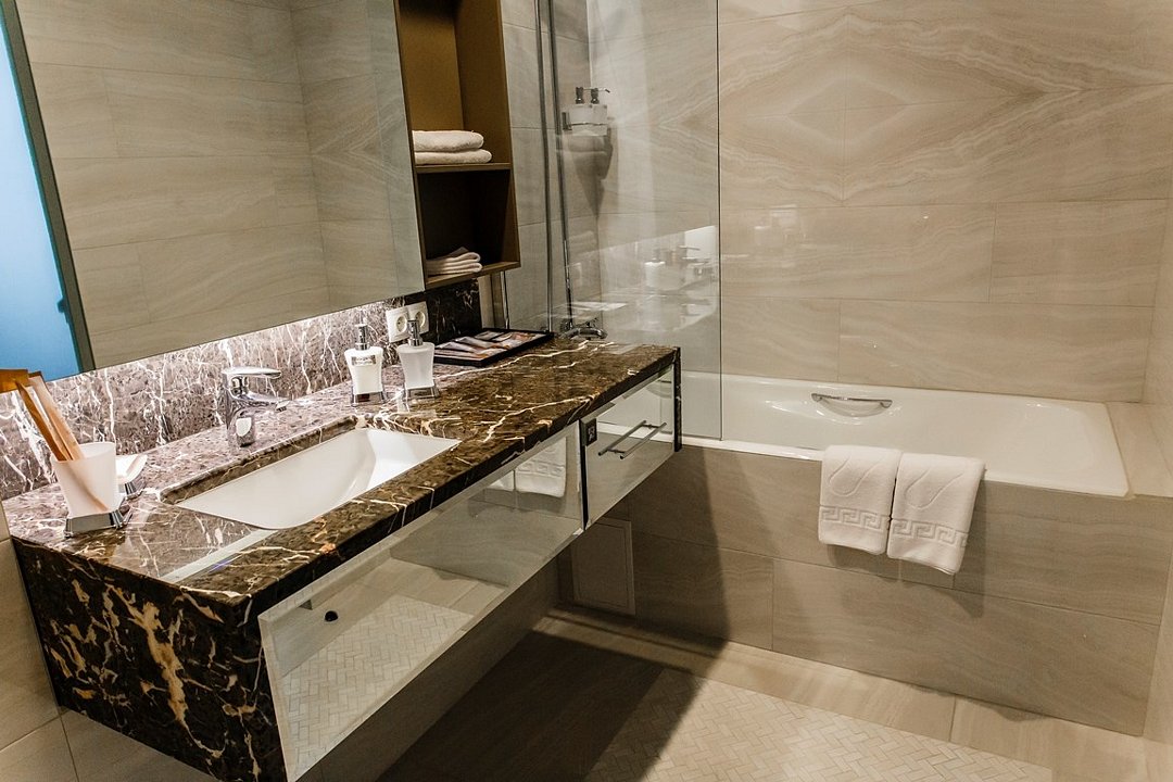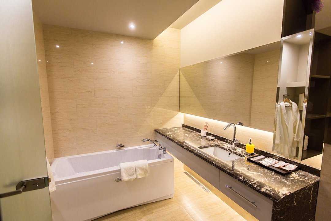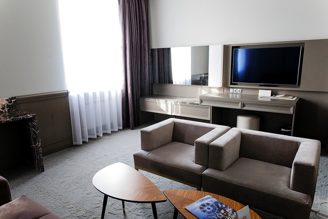 телевизор, Wi-Fi, телефон, кондиционер, фен, ванна, санузел, халаты, банные полотенца, тапочки, гигиенические средства, двуспальная кровать, гладильная доска, диван, кресла, тумбы, шкаф для одежды, журнальный столик, багажная тумба, зеркало, две комнаты, мини-бар, чайный набор, обслуживание номеров, информационная карта, меню, сейф, питьевая вода, гостиная зона, вид на город, столовые приборы, туалетный столик, диван-кровать, раскладной диван, мини-холодильник, номер для некурящих, пуфик, рабочий столВ номере