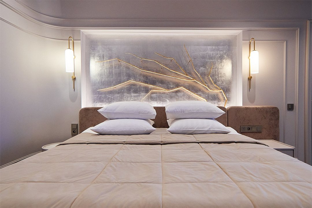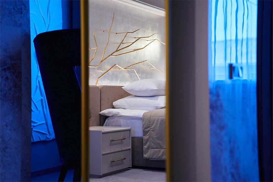 Однокомнатный номер в стиле современной классики с дизайнерскими элементами. В номере предусмотрено несколько вариантов световых сценариев. Это делает его идеальным местом не только для проведения любых видов фотосессий, но и невероятно комфортабельным для проживания. Большинство элементов декора сделаны на заказ. Среди них: поворотное зеркало с креплением для вашего наряда, дизайнерское панно, авторские светильники, создающие несколько вариантов освещения как днем, так и ночью. А просторный коридор с зеркалом, создает иллюзию бесконечно расширяющегося пространства. Площадь: 45 кв.м.Услуги и удобства