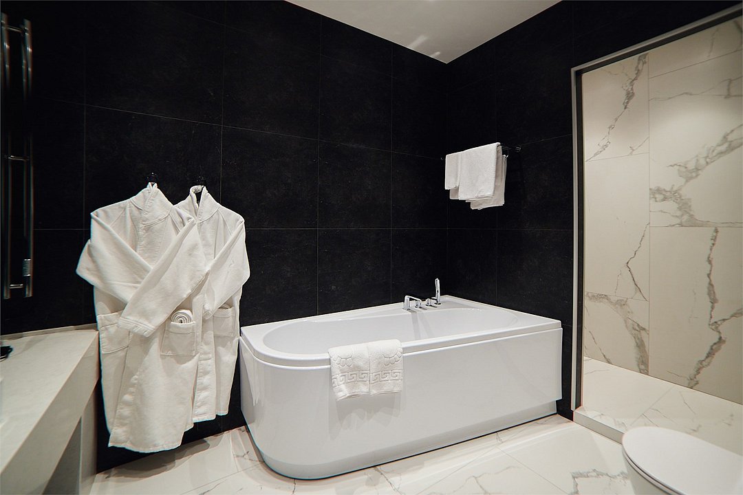 Современный однокомнатный номер по типу “Студия”, где вы можете расслабиться и насладиться отдыхом. Войдя в этот номер, вы ощутите себя в дизайнерском пространстве, продуманном до мелочей для абсолютного комфорта. Удобная кровать с мягкими подушками и постельным бельем высокого качества обещает вам ночь полного релакса и отдыха. Просторная ванная комната с современной сантехникой и отдельным душевой зоной позволит вам ощутить себя VIP гостем. Площадь: 35 кв.м.Услуги и удобства