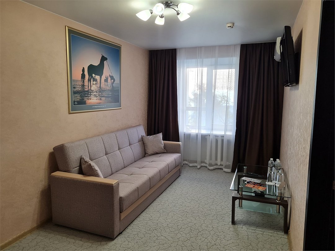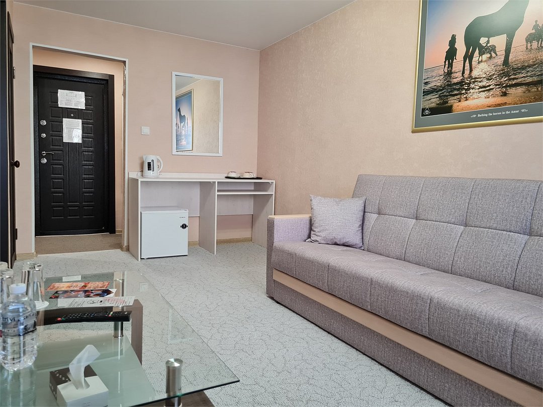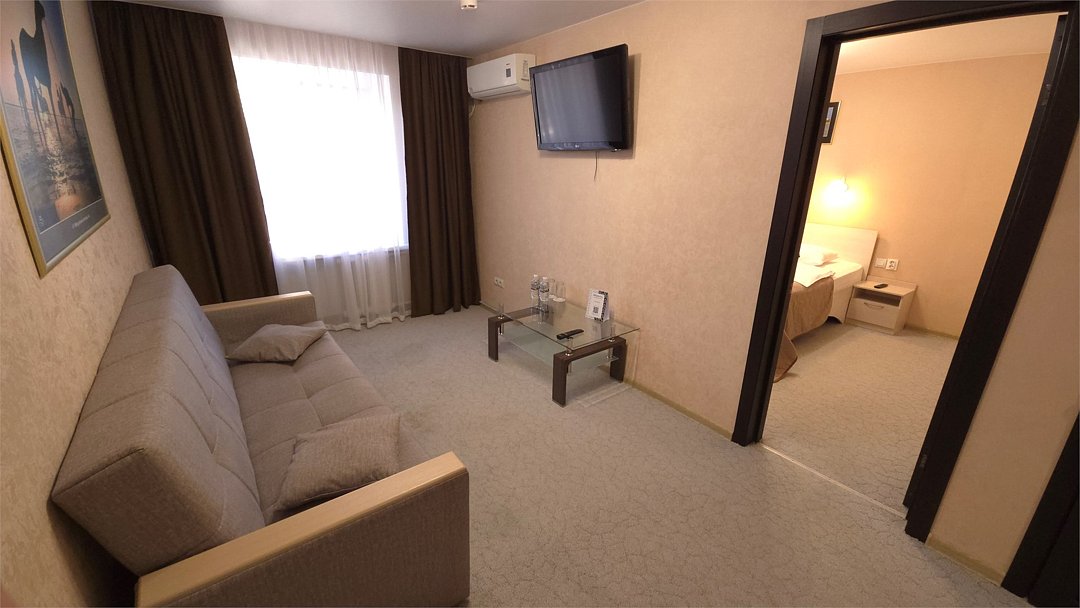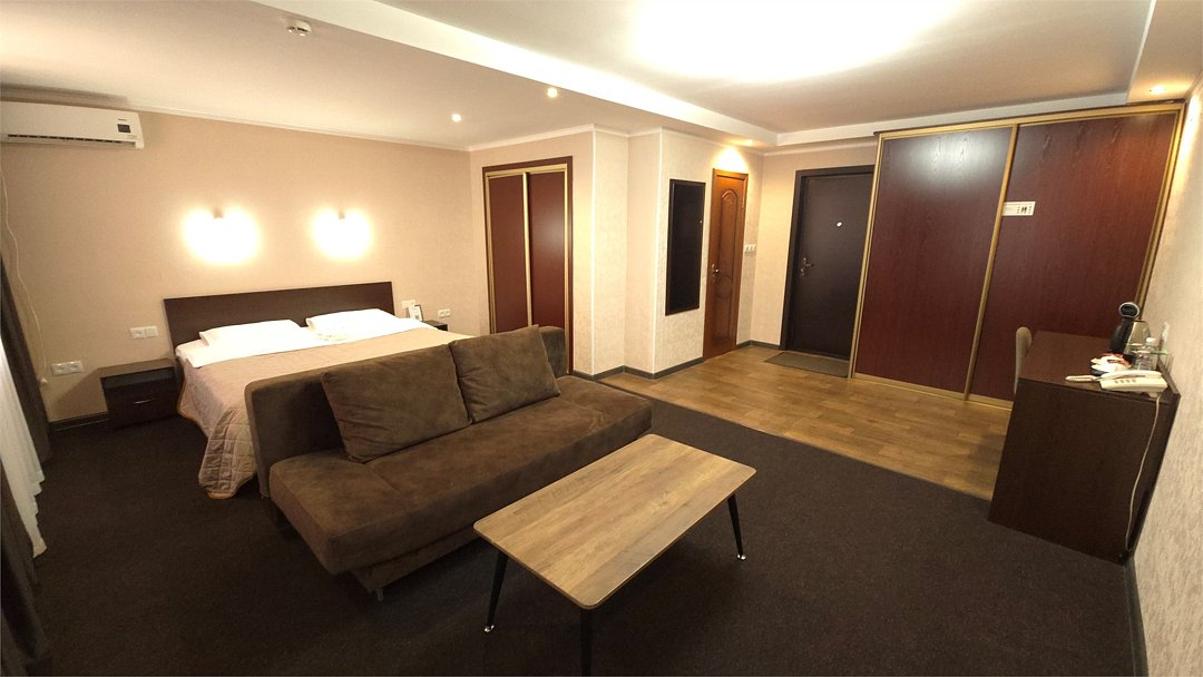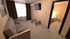 Роскошный двухкомнатный номер, состоящий из гостиной, спальни и ванной. Идеально подходит для длительного проживания. В гостиной находятся удобный диван, мини-бар, телефон, сейф, бесплатный Wi-Fi. В изолированной спальне — большая двуспальная кровать. Оснащены чайным набором, минеральной водой, махровыми халатами и тапочками. В ванной комнате: ванна, туалет, гигиенические принадлежности, халаты и тапочки.Услуги и удобства
