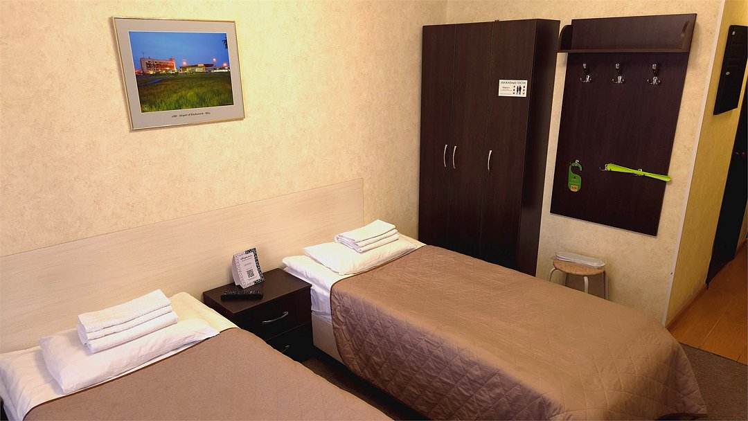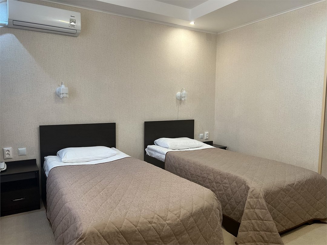 Wi-Fi, телефон, кондиционер, фен, система безопасности, утюг, обогреватель, ванная комната, ванна, санузел, водонагреватель, халаты, банные полотенца, тапочки, гигиенические средства, две односпальные кровати, гладильная доска, тумбы, стулья, шкаф для одежды, зеркало, звуконепроницаемые стены и окна, чайный набор, обслуживание номеров, информационная карта, меню, сейф, чайник, унитаз, раковина, питьевая вода, ковровое покрытие, отопление, душ, вид на город, кулер на этаже, вид во двор, туалетные средства, туалет, цифровое тв, внутренний телефон, телевизор с плоским экраном, мини-холодильник, москитная сеткаВ гостиничном номере