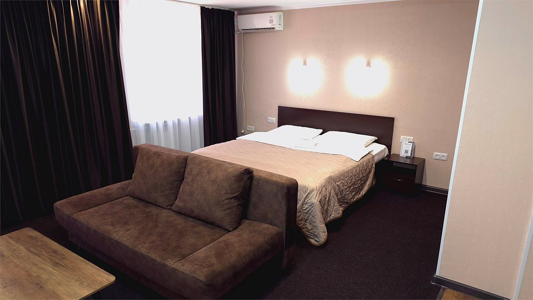телевизор, Wi-Fi, телефон, холодильник, кондиционер, светильник, фен, ванна, банные принадлежности, халаты, гигиенические средства, двуспальная кровать, тумбы, шкаф для одежды, вешалки, чайный набор, чайник, раковина, отопление, кулер на этаже, вид во двор, стаканы, туалет, раскладной диван, мини-холодильник, двуспальный раскладной диван-кровать, уборка номераВ гостиничном номере