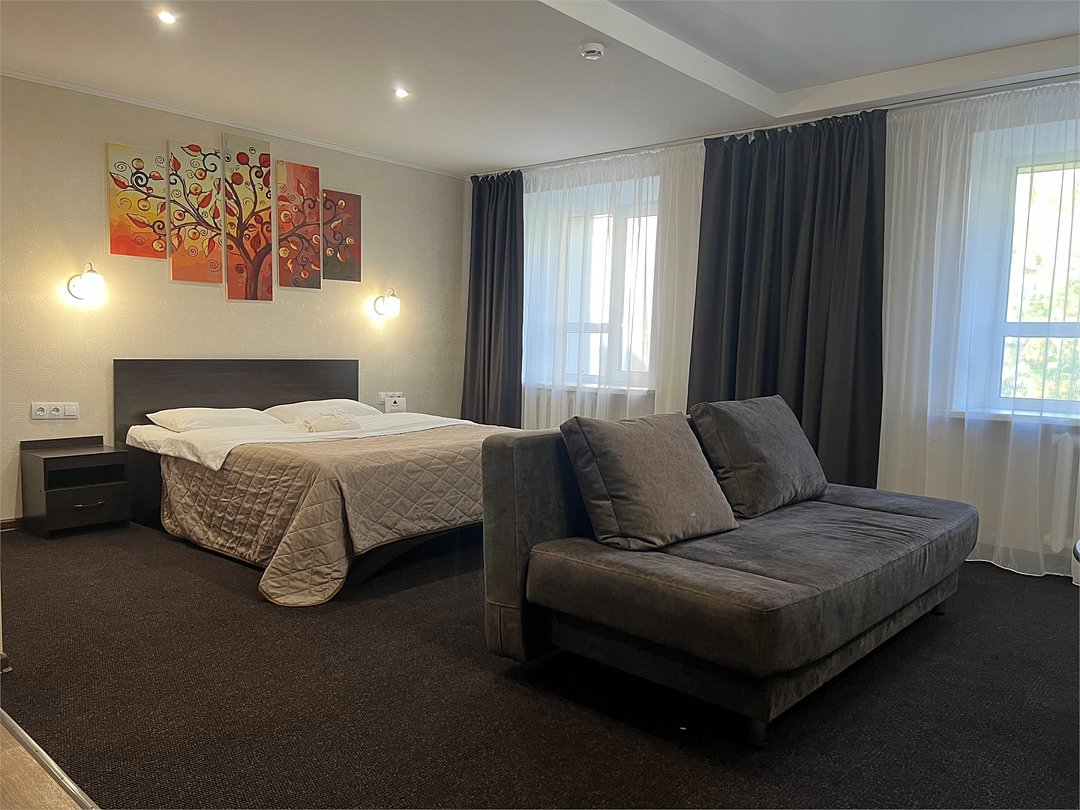 Номер категории "Улучшенный с двуспальной кроватью" отлично подойдет для проживания одного Гостя или пары. Наличие в гостиной зоне раскладного дивана позволят с комфортом разместить третьего Гостя. Номер для некурящих.Услуги и удобства