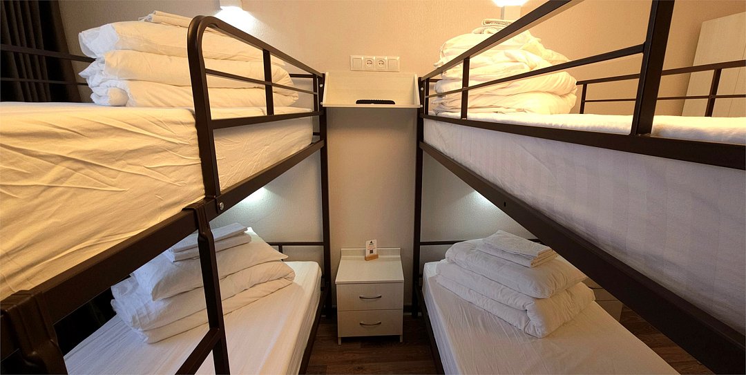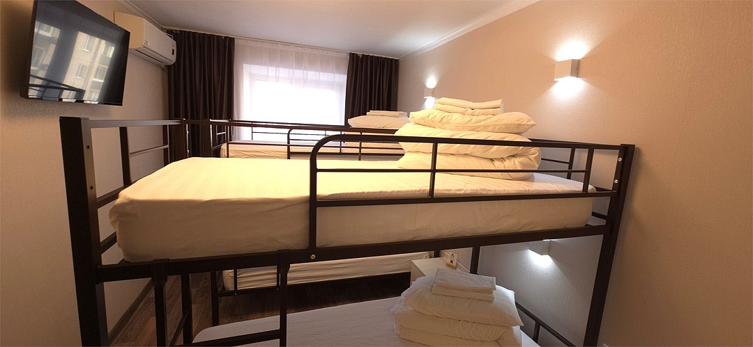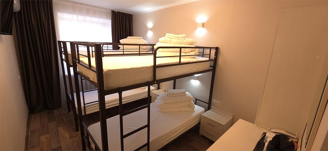 телевизор, Wi-Fi, телефон, кондиционер, светильник, фен, ванна, банные принадлежности, тапочки, тумбы, шкаф для одежды, вешалки, чайный набор, чайник, раковина, отопление, кулер на этаже, вид во двор, стаканы, стол, туалет, уборка номера, две двухъярусные кроватиВ гостиничном номере