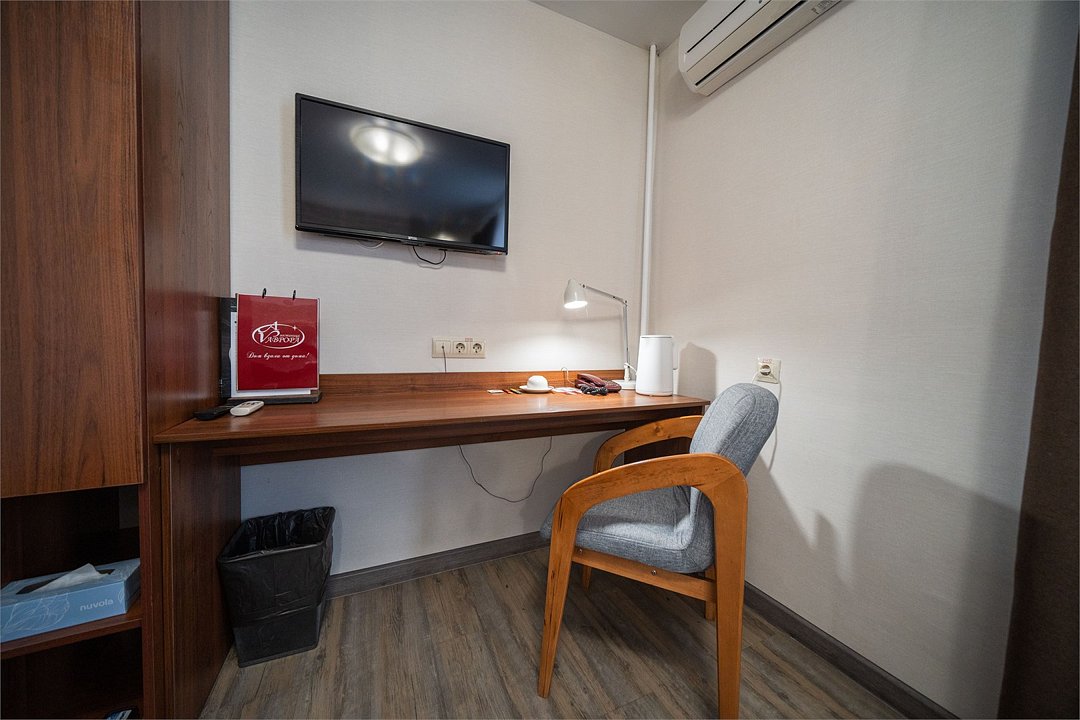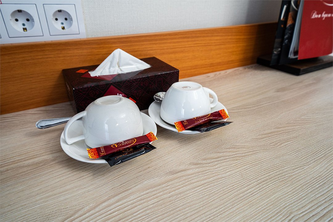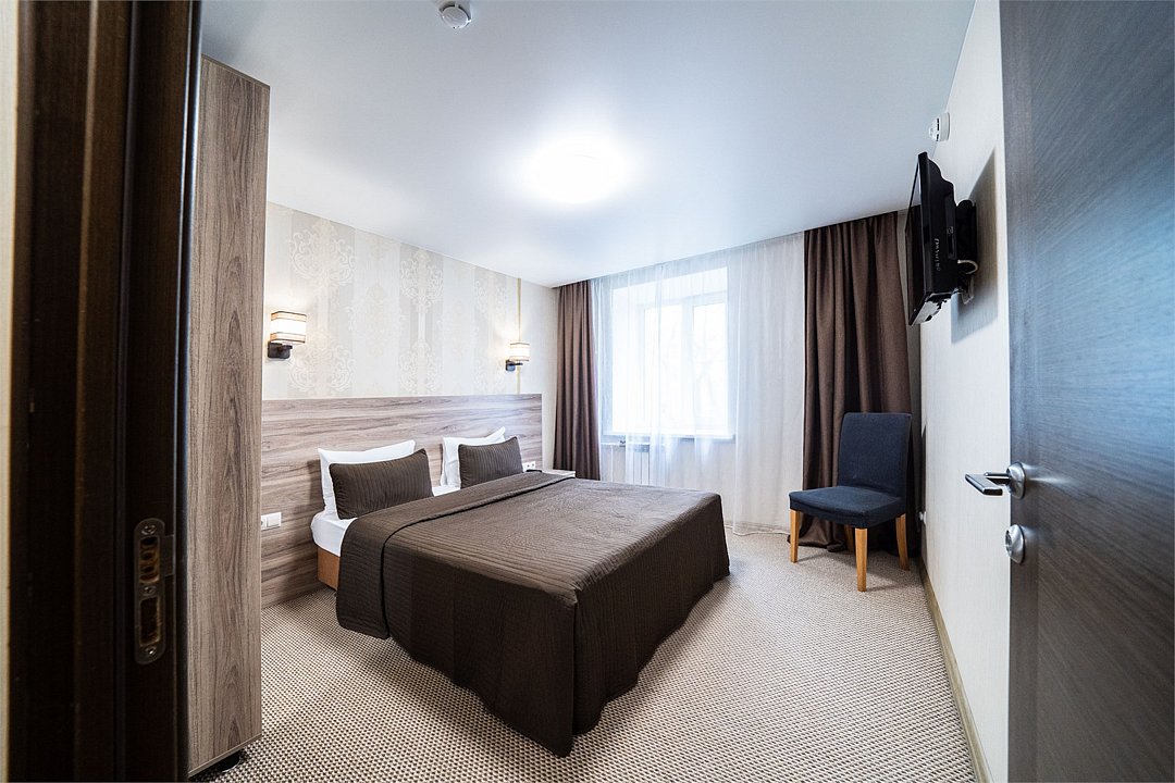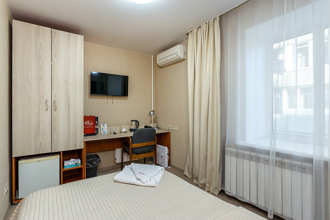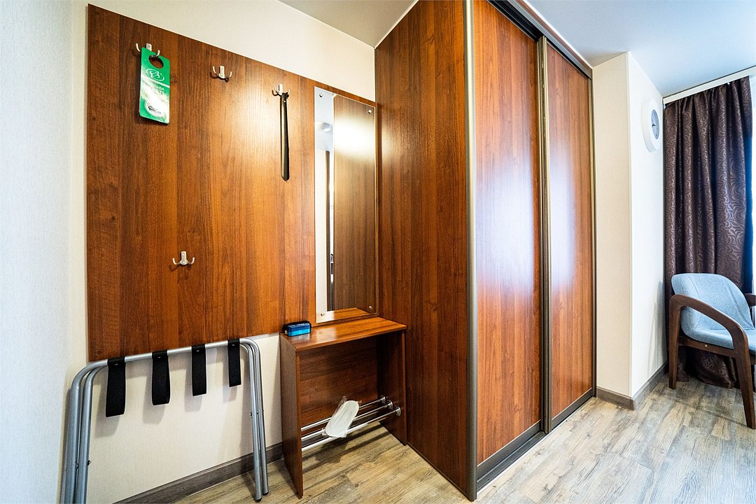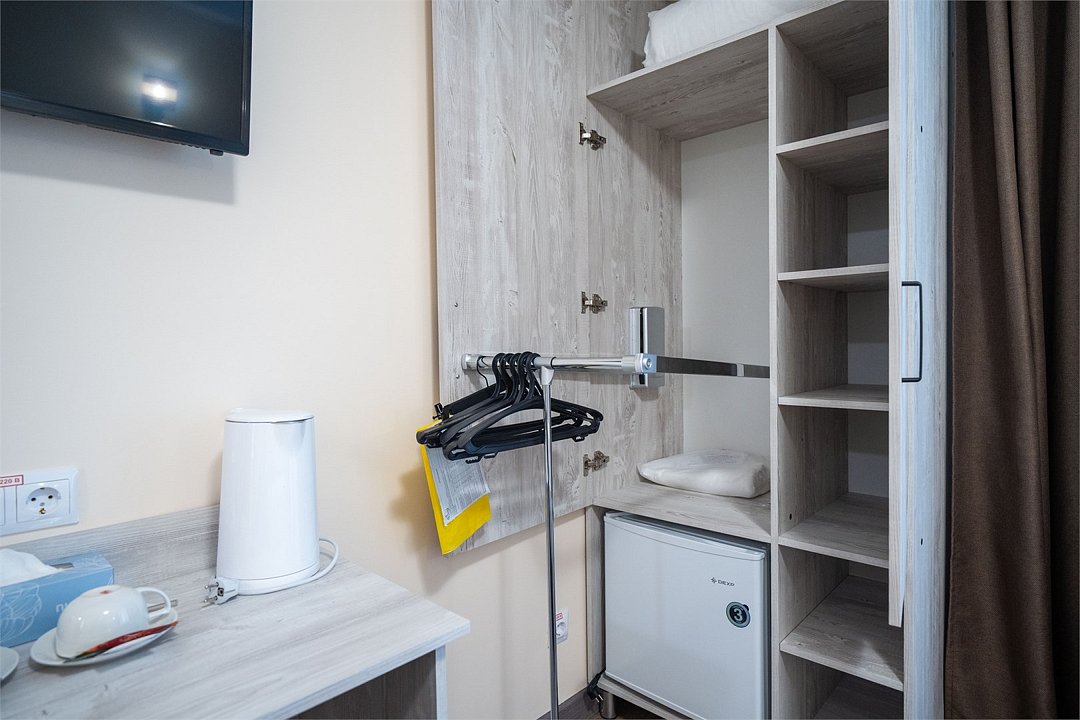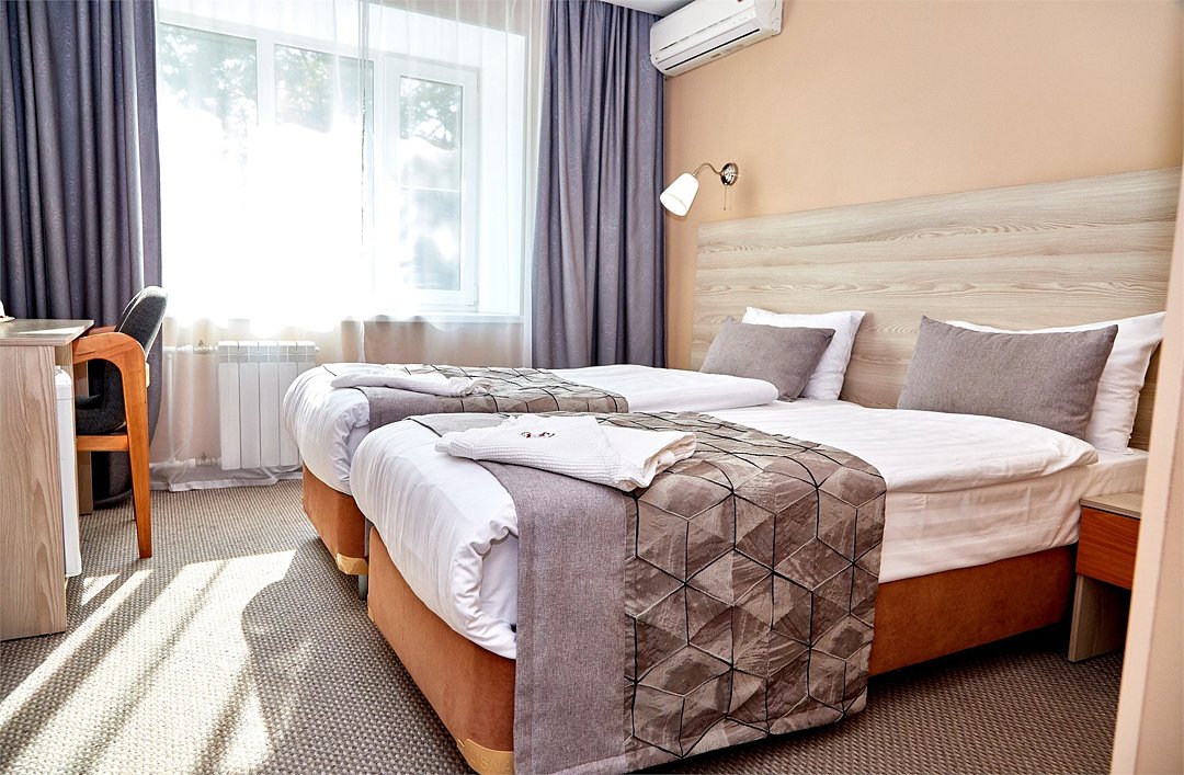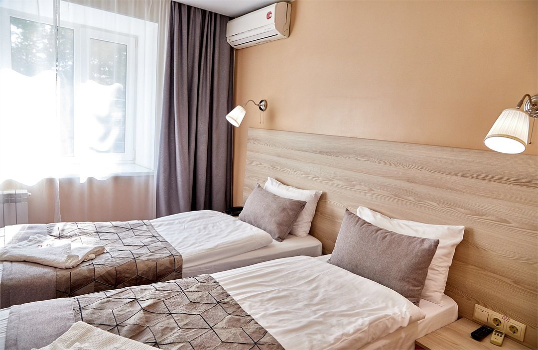кабельное телевидение, Wi-Fi, кондиционер, светильник, фен, электронные замки, ванная комната, душевая кабина, халаты, банные полотенца, тапочки, гигиенические средства, две односпальные или большая двуспальная кровать, шкаф для одежды, вешалки, багажная тумба, зеркало, чайный набор, обслуживание номеров, чайник, унитаз, раковина, отопление, вид на город, кулер на этаже, стул, стол, тумба, сушилка для белья, внутренний телефон, телевизор с плоским экраном, мини-холодильник, москитная сетка, номер для некурящих, оснащение для гостей с ограниченными возможностями, уборка номера, набор для приготовления чая и кофе, услуги прачечной (платно), вешалки-плечики, шапочка для душа, мыло, прачечная (за дополнительную плату), онлайн-регистрация, можно с питомцамиВ гостиничном номере