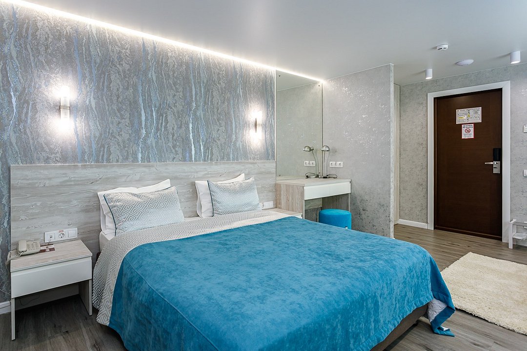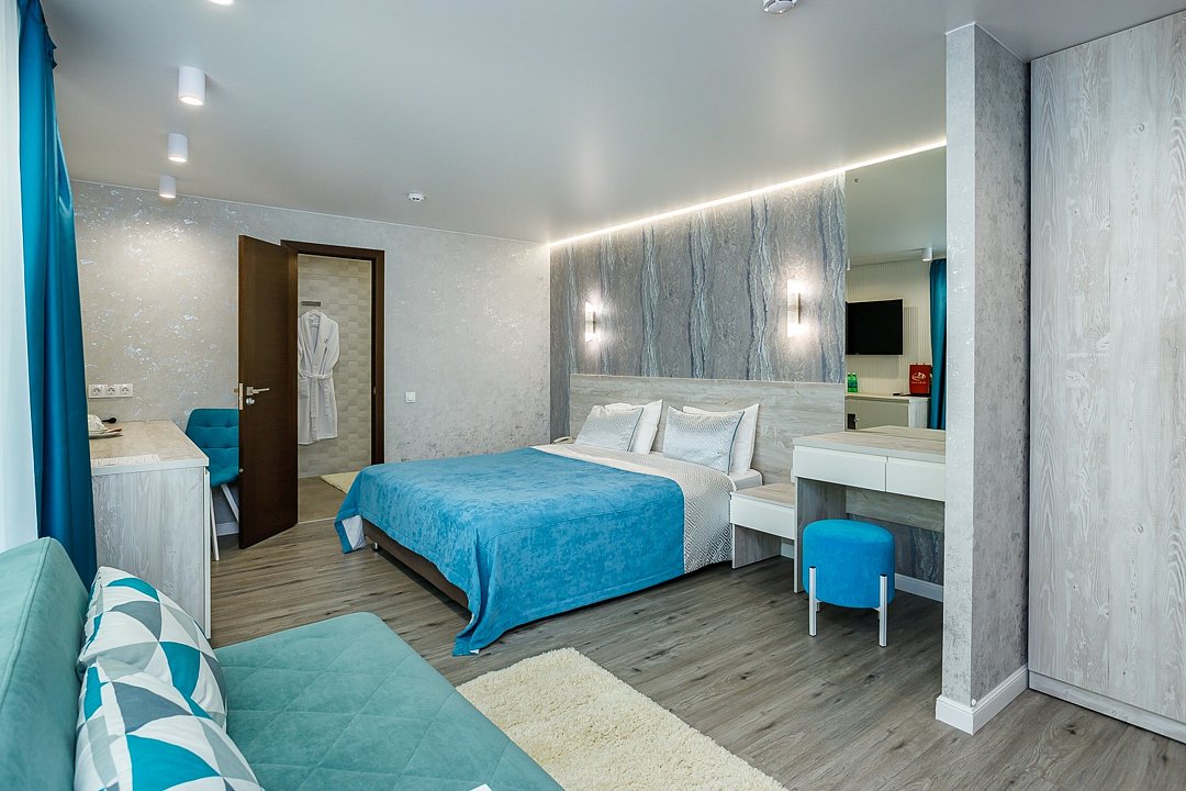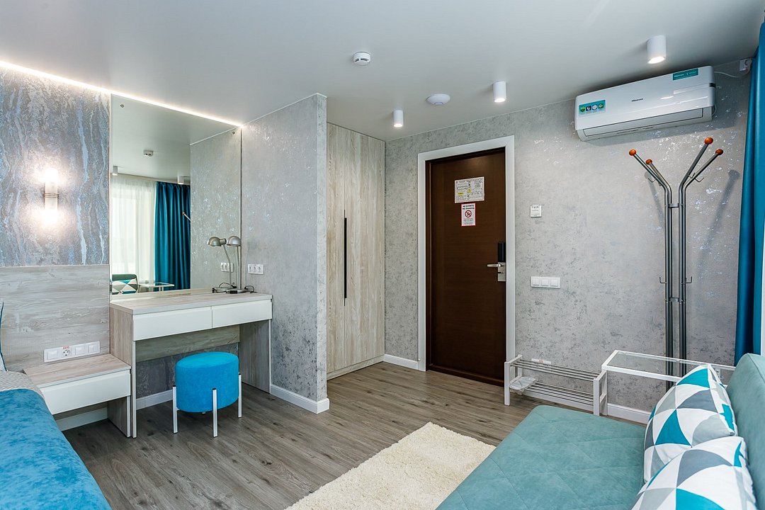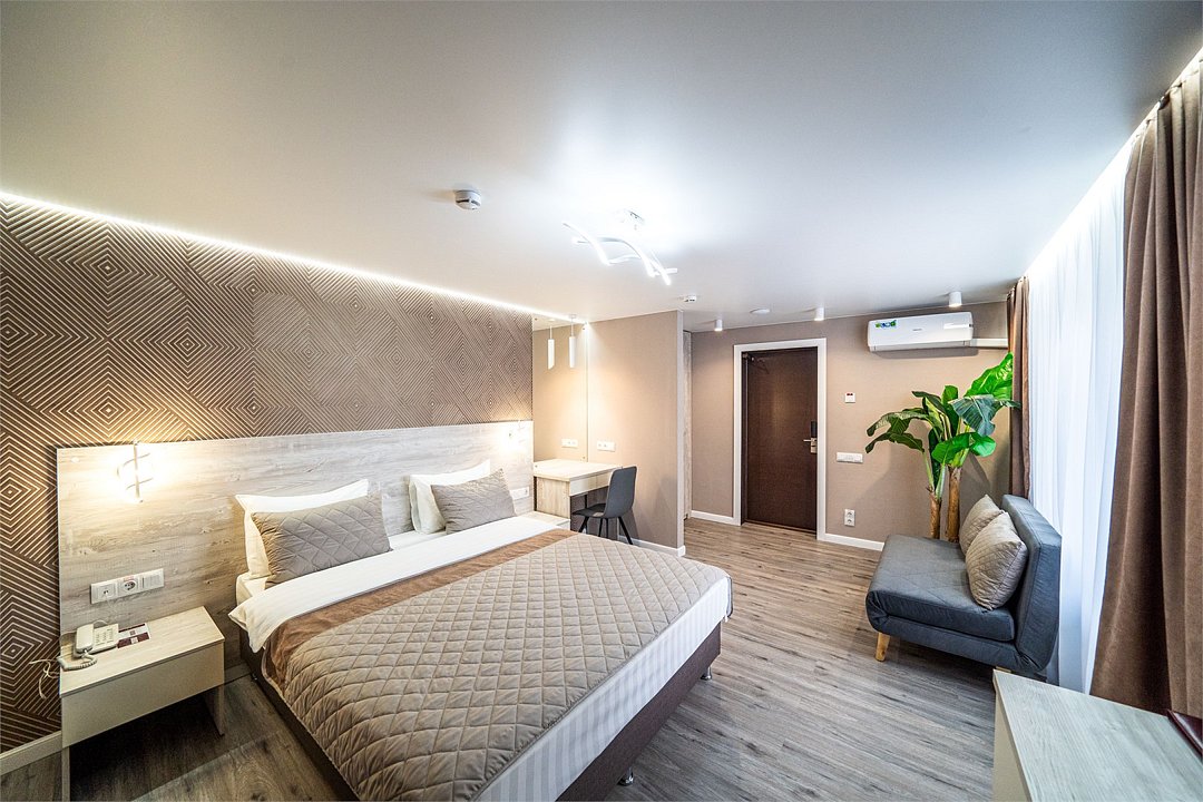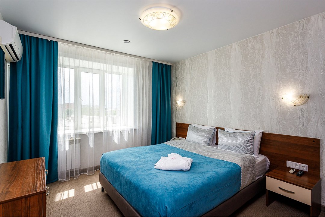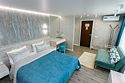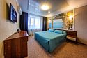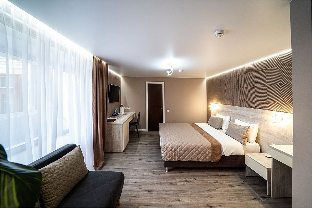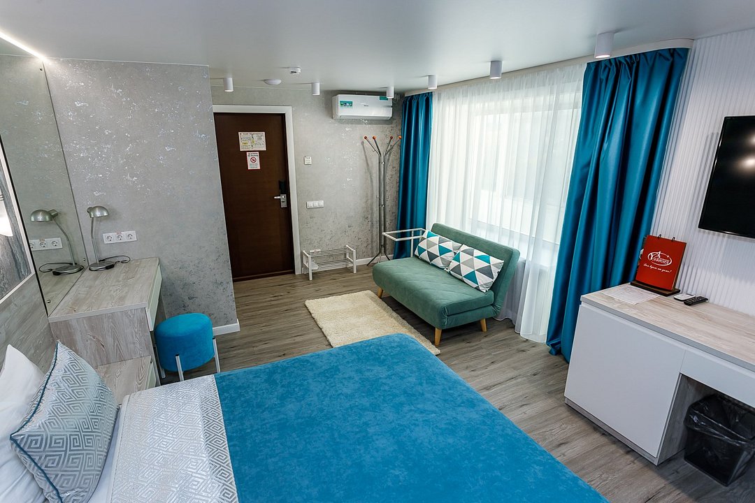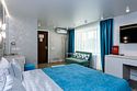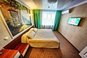Просторный, улучшенный однокомнатный номер площадью до 25,4 кв.м с балконом подходит для отдыха как двоих человек, так и семьи с ребенком с дополнительным спальным местом. В номере одна большая кровать 160х200 см., диван, кондиционер, холодильник, собственный санузел с ванной. Ребенок до 6 лет без места - размещается бесплатно.Услуги и удобства