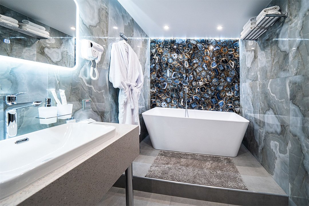 кабельное телевидение, Wi-Fi, телефон, кондиционер, система климат-контроля, светильник, фен, система безопасности, электронные замки, ванная комната, ванна, теплый пол, халаты, банные полотенца, тапочки, гигиенические средства, балкон, двуспальная кровать, тумбы, шкаф для одежды, вешалки, зеркало, чайный набор, обслуживание номеров, информационная карта, меню, чайник, унитаз, раковина, питьевая вода, отопление, вид на город, кулер на этаже, ламинат, стул, стол, туалетные средства, сушилка для белья, внутренний телефон, телевизор с плоским экраном, мини-холодильник, москитная сетка, теплые полы, без питомцевВ номере