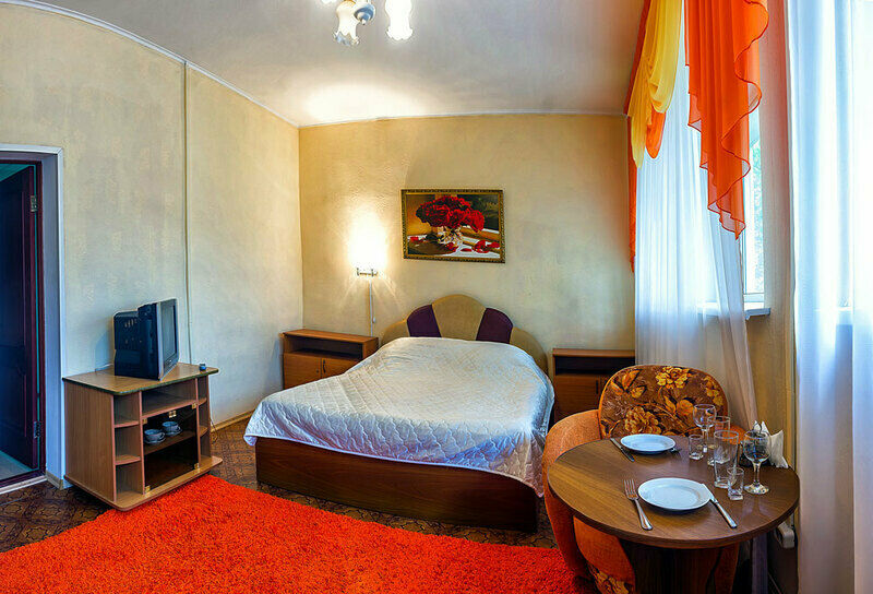 Двуспальная кровать, зона отдыха (стол, два кресла), телевизор, холодильник, чайник, кондиционер, санузел (туалет, раковина, душевая кабина, холодная и горячая вода).