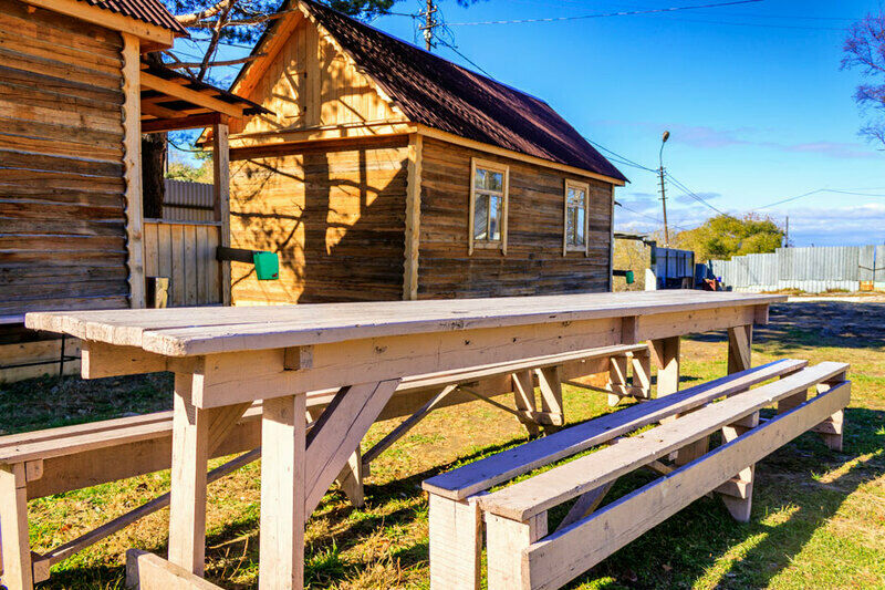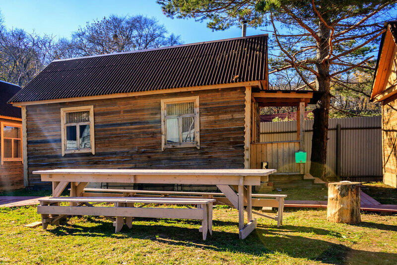 Домик дневного пребывания представляет собой беседку закрытого типа, установлен стол, лавочки, подведено электричество. Два домика на 20 человек, три домика на 10 человек