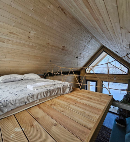 Панорамные окна открывают невероятный вид на рассвете и закате, на заснеженное озеро и природу вокруг. Заезд доступен с 14:00, выезд — до 12:00.