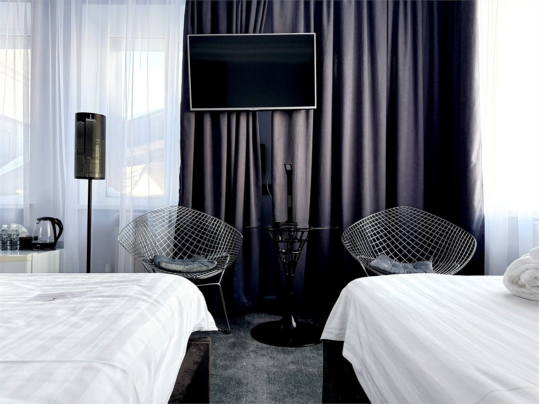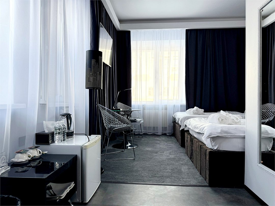 телевизор, Wi-Fi, телефон, холодильник, кондиционер, светильник, фен, ванна, санузел, банные принадлежности, халаты, банные полотенца, две полутораспальные кровати, ортопедический матрас, кресла, стулья, вешалки, журнальный столик, багажная тумба, зеркало, чайный набор, обслуживание номеров, сейф, чайник, раковина, косметическое зеркало, обеденная зона, ковровое покрытие, отопление, душ, кулер на этаже, плиточное покрытие, стаканы, столовые приборы, стол, уборка номера, набор для приготовления чая и кофе, услуги прачечной (платно), бутилированная вода, можно с питомцамиВ гостиничном номере