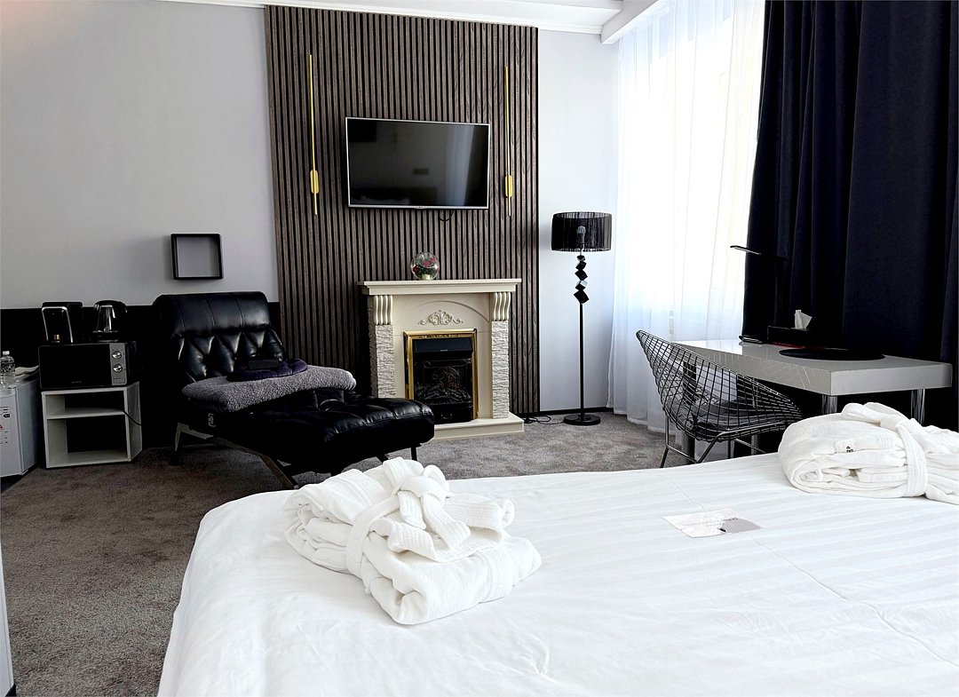 телевизор, кабельное телевидение, Wi-Fi, интернет, холодильник, кондиционер, фен, кофемашина, микроволновая печь, душевая кабина, ванна, санузел, халаты, банные полотенца, тапочки, косметические средства, двуспальная кровать, ортопедический матрас, стулья, вешалки, журнальный столик, багажная тумба, барная стойка, ковер, камин, набор посуды, обслуживание номеров, сейф, раковина, косметическое зеркало, ковровое покрытие, душ, плиточное покрытие, кресло, столовые приборы, туалетные средства, туалет, цифровое тв, внутренний телефон, мини-холодильник, шкаф-купе, уборка номера, набор для приготовления чая и кофе, вешалки-плечики, бутилированная вода, шапочка для душа, мыло, зеркало в полный рост, можно с питомцамиВ гостиничном номере