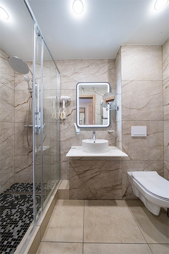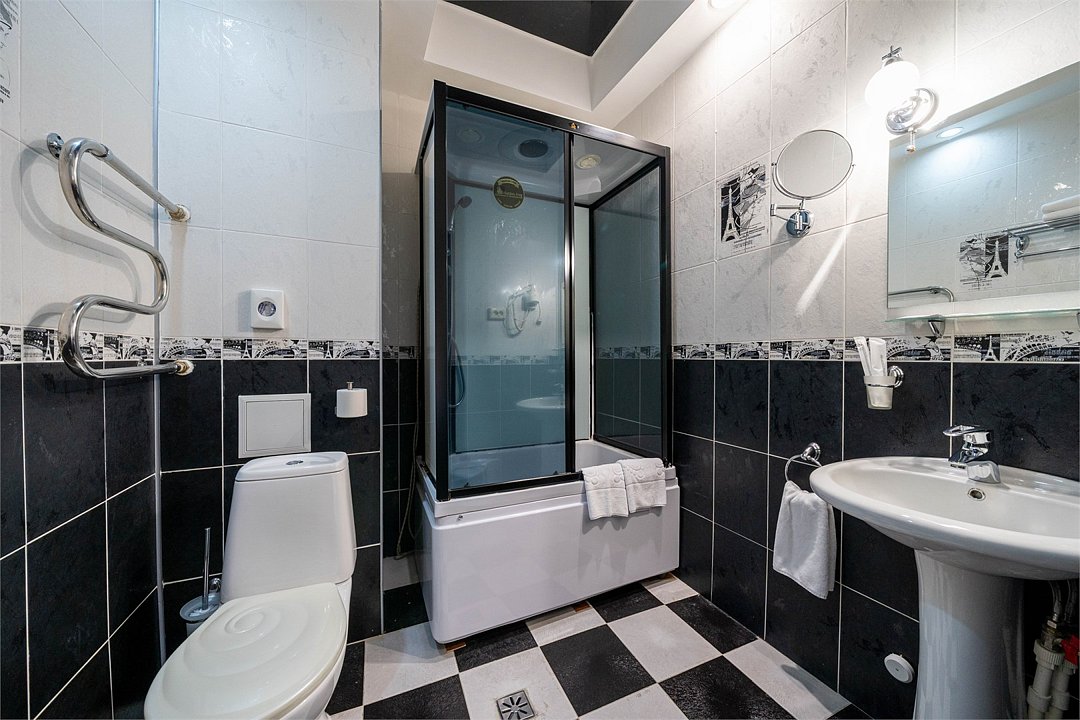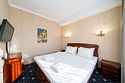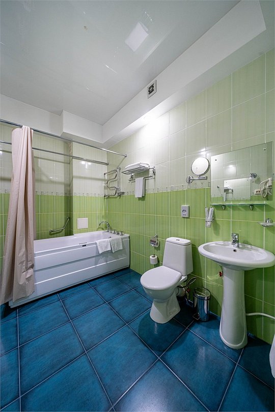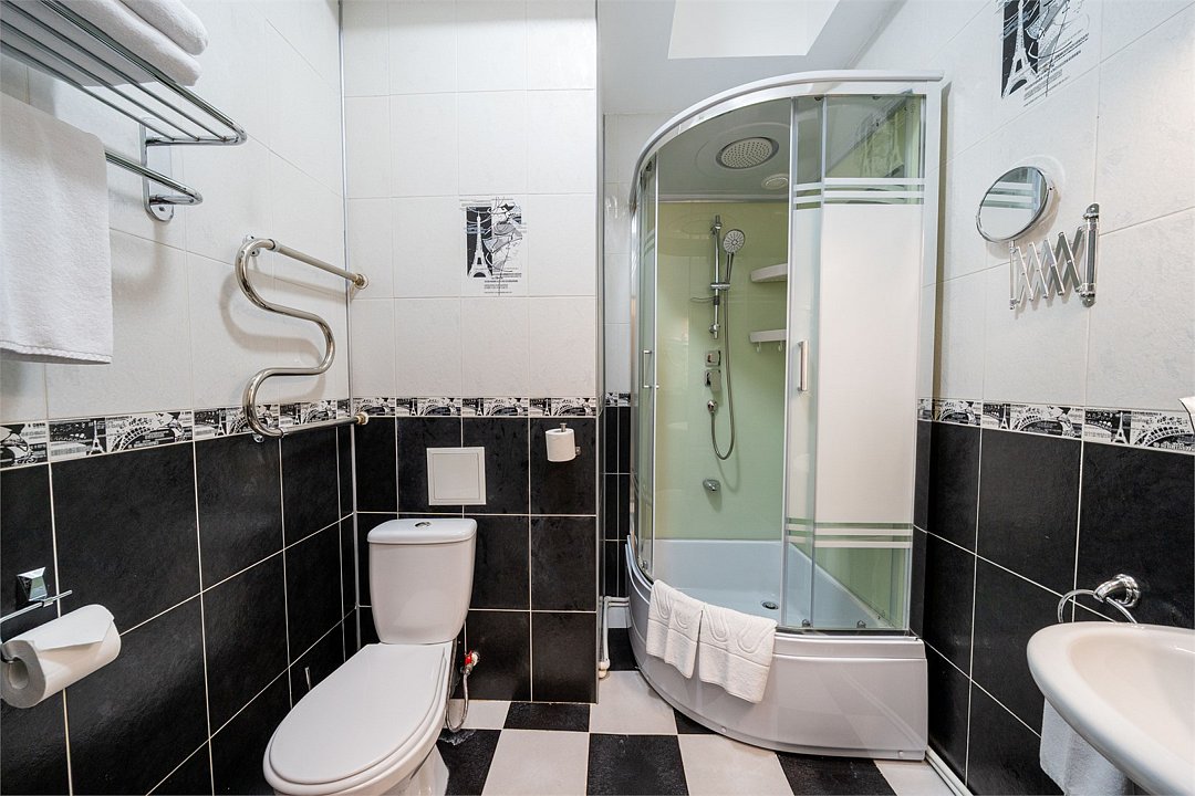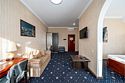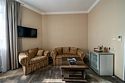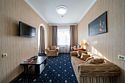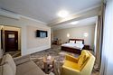 Уютный двухкомнатный номер площадью 45м с гостиной комнатой и спальной зоной. Этот номер максимально гибко отвечает современным потребностям профессионалов, особенно тех, кто желает совместить отдых с профессиональной деятельностью. Ванная комната декорирована плиткой с изображением европейских достопримечательностей. А также, особенностью данной категории номера является наличие балкона.Услуги и удобства