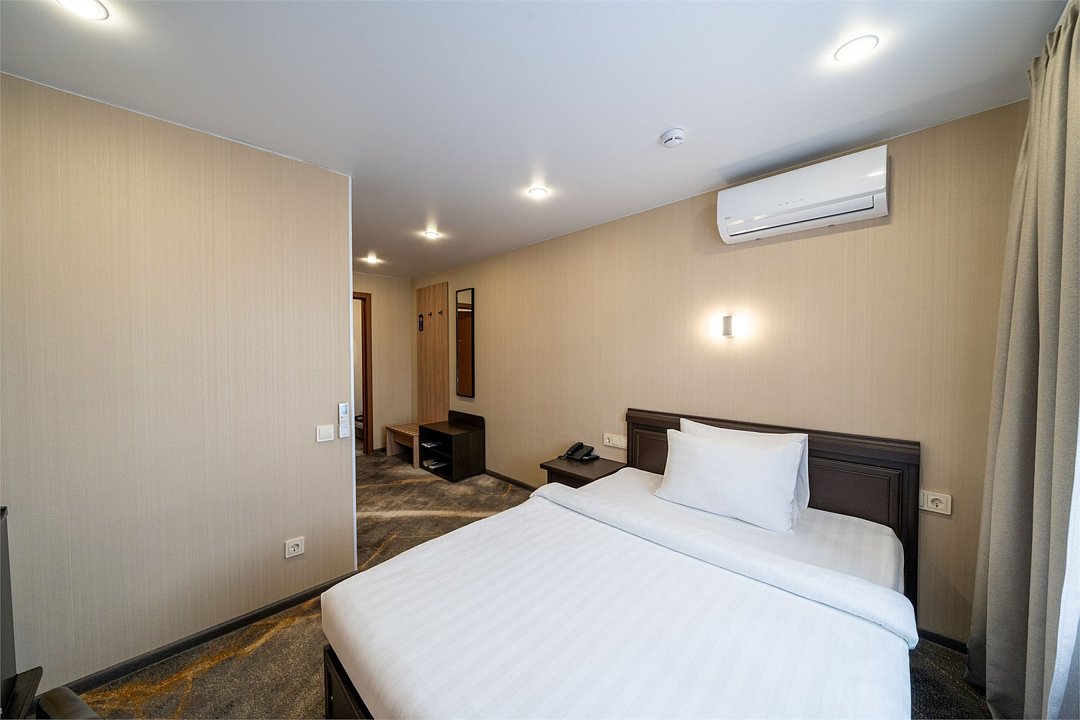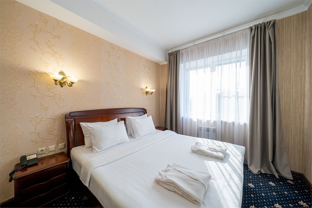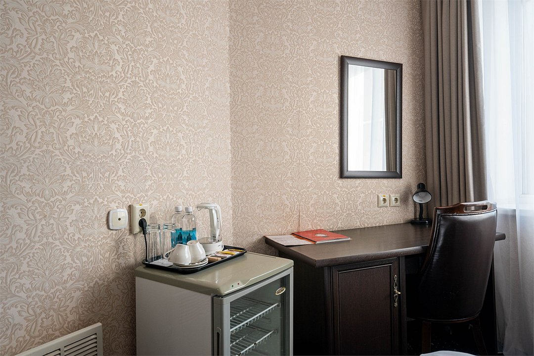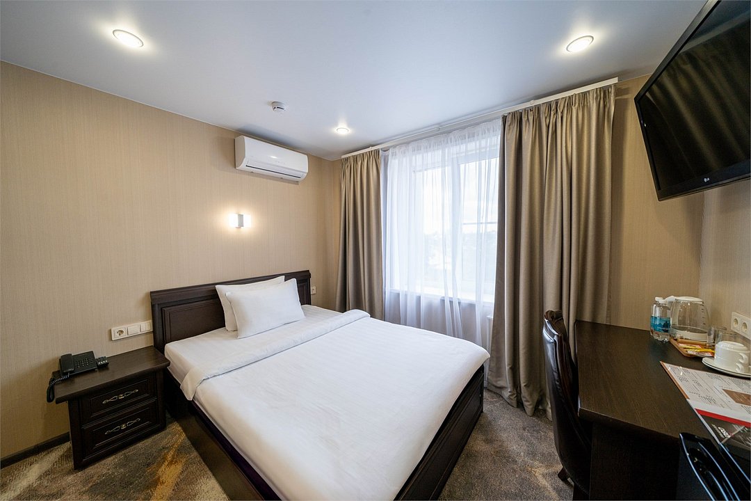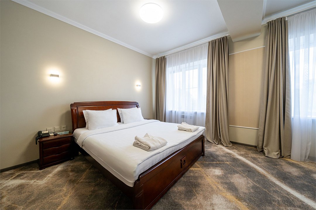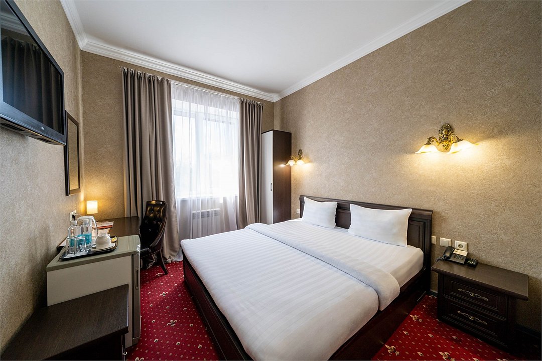 Wi-Fi, IP-телефон, холодильник, кондиционер, настольные лампы, фен, электронные замки, обогреватель, душевая кабина, банные полотенца, тапочки, косметические средства, кровать «King size», тумбы, шкаф для одежды, письменный стол, багажная тумба, зеркало, сейф, раковина, косметическое зеркало, ковровое покрытие, душ, вид на город, вид во двор, стул, туалет, мини-холодильник, телевизор со Smart TV, номер для некурящих, гигиенический душ, уборка номера, набор для приготовления чая и кофе, вешалки-плечики, бутилированная вода, затемняющая штора, прачечная (за дополнительную плату)В номере