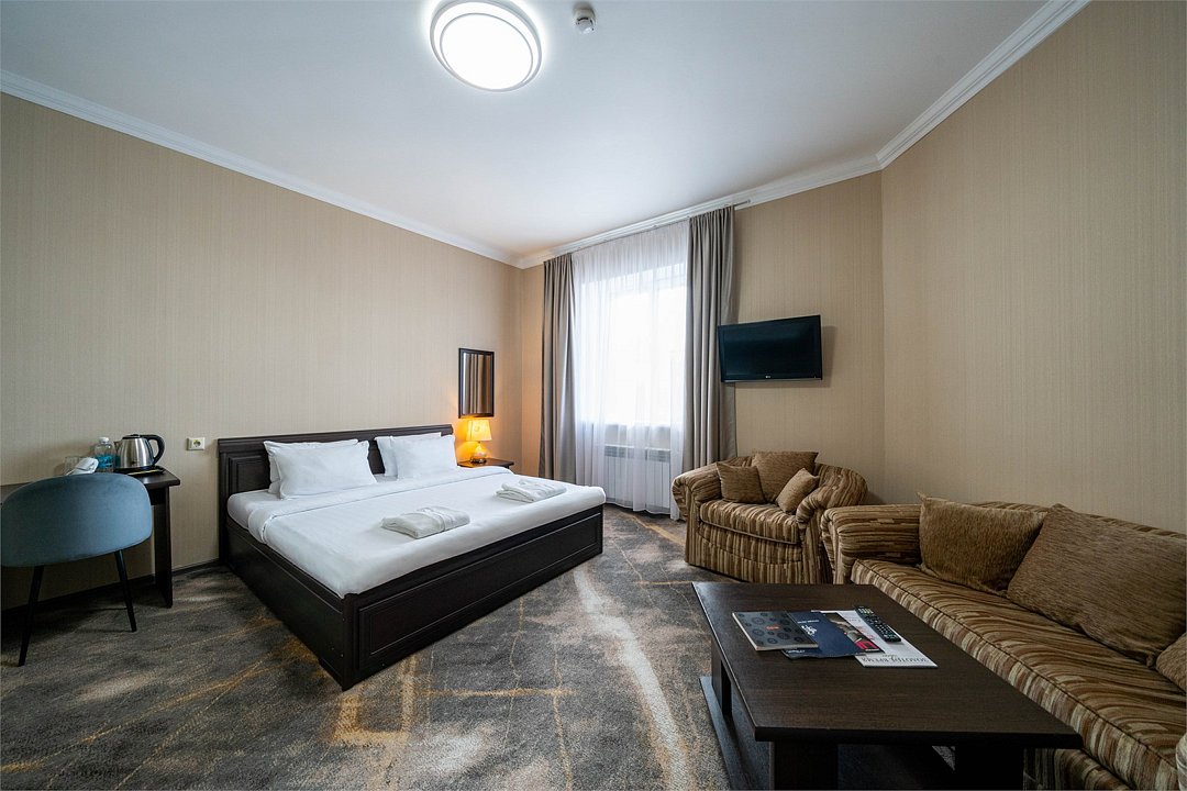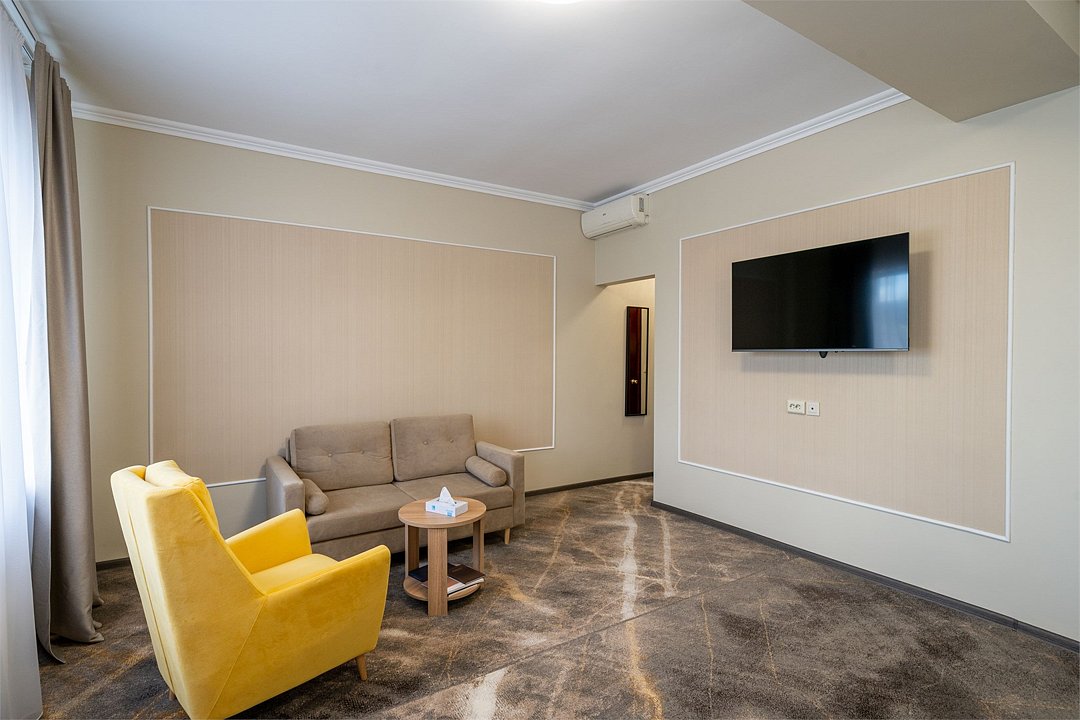 Просторный номер, площадью 40 м с уютным уголком для отдыха и всеми необходимыми удобствами. Данная категория номера отлично подойдёт для семейного отдыха.Услуги и удобства