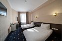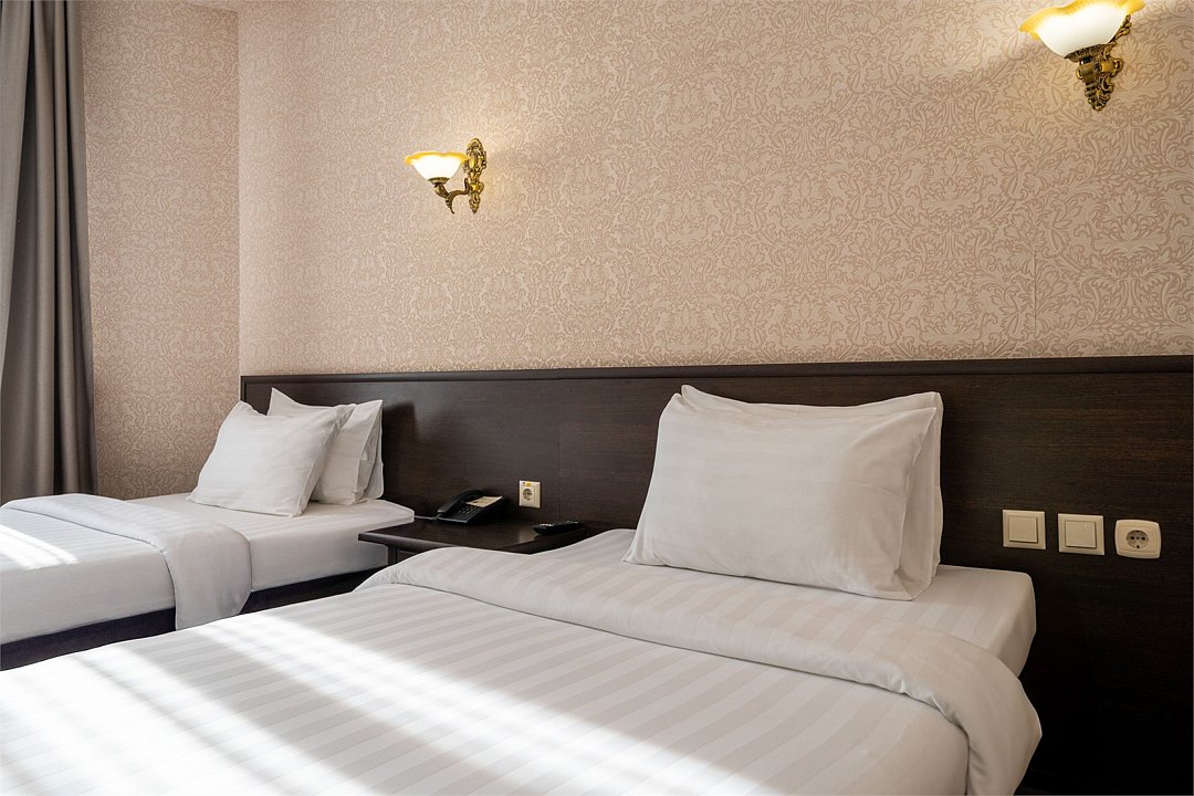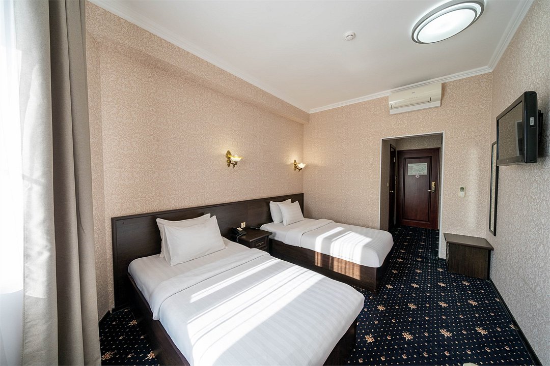Wi-Fi, IP-телефон, кондиционер, светильник, фен, электронные замки, обогреватель, душевая кабина, банные полотенца, тапочки, косметические средства, две односпальные кровати, шкаф для одежды, письменный стол, зеркало, чайный набор, сейф, чайник, раковина, ковровое покрытие, вид на город, вид во двор, стул, тумба, туалет, телевизор с плоским экраном, мини-холодильник, уборка номера, вешалки-плечики, бутилированная вода, мини-бар (платно), мыло, затемняющая штора, прачечная (за дополнительную плату)В номере