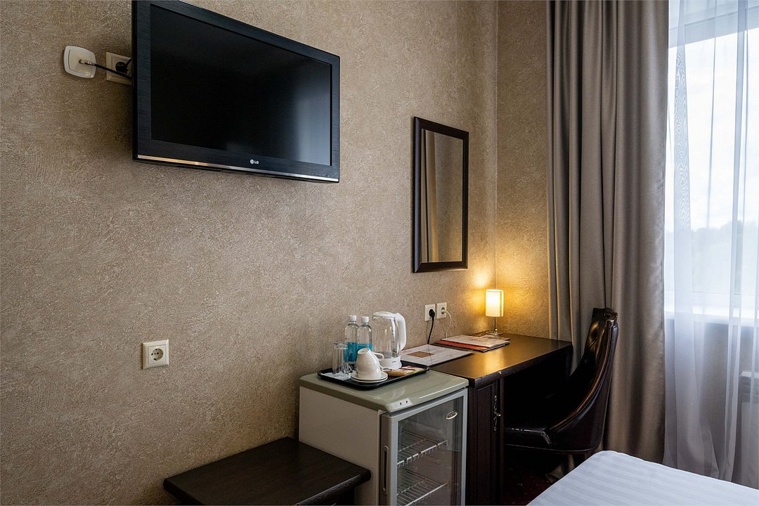телевизор, Wi-Fi, IP-телефон, кондиционер, настольные лампы, фен, электронные замки, обогреватель, душевая кабина, банные полотенца, тапочки, односпальная кровать, шкаф для одежды, вешалки, письменный стол, зеркало, сейф, чайник, раковина, питьевая вода, ковровое покрытие, вид на город, кулер на этаже, вид во двор, стул, тумба, туалетные средства, туалет, телевизор с плоским экраном, мини-холодильник, номер для некурящих, уборка номера, набор для приготовления чая и кофе, мини-бар (платно), прачечная (за дополнительную плату)В номере