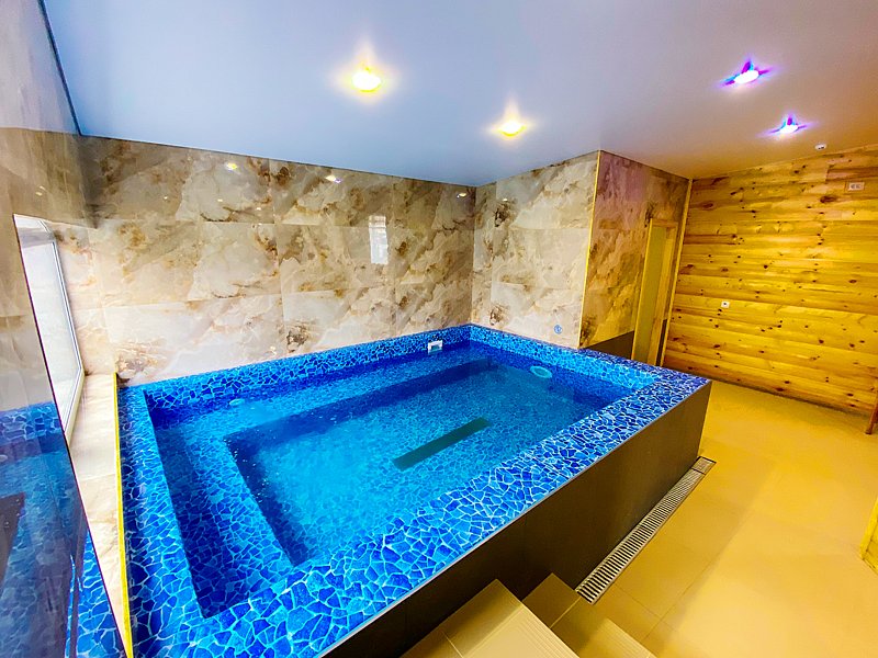 Уютный зал до 8 чел. Турецкий хамам. Обеденная зона. Комната отдыха. Бассейн с гидромассажем. Температура воды в бассейне 24-26 градусов, глубиной 140-160 см. "SMART-TV", бесплатный Wi-Fi.