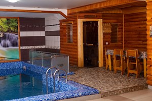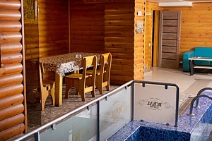 Зал рассчитан на компанию до 8 человек (максимальная вместимость до 10 чел). Финская парная. Комната отдыха. Бассейн с гейзером 5х3м., глубиной 160 см. Температура воды в бассейне +24-26C.