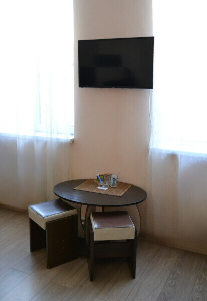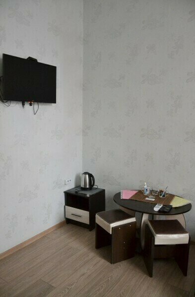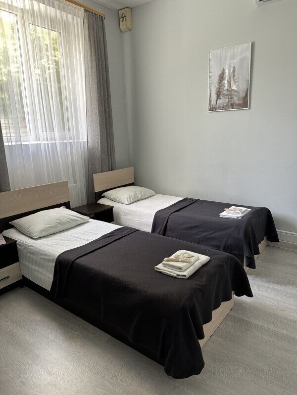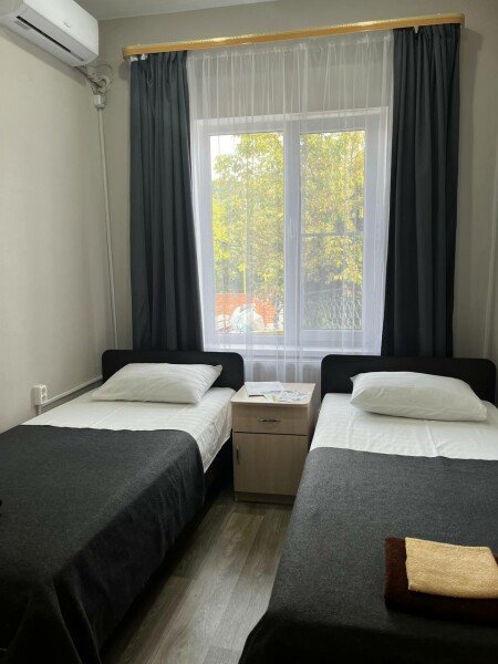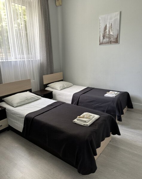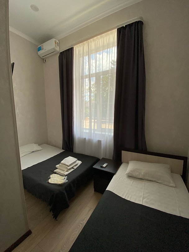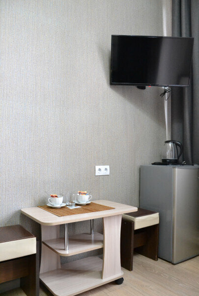 В номере установлены две односпальные кровати для отдыха и проживания до 2 человек, а также шкаф, журнальный столик, зеркало, телевизор, кондиционер, электрочайник, кружки, чай, сахар.