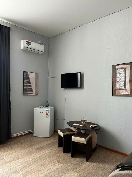 В номере категории «Эконом» установлены две односпальные кровати, а также шкаф, журнальный столик, зеркало, телевизор, кондиционер, холодильник, электрочайник, кружки, чай, сахар, раковина.