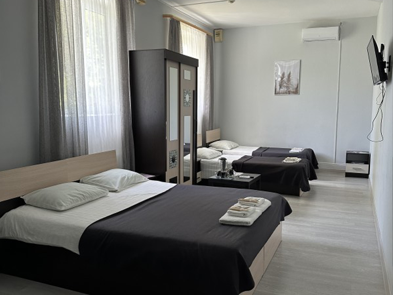 В номере установлена двуспальная, односпальная, двухъярусная кровать и диван, а также есть холодильник, шкаф, прикроватные тумбочки, журнальный столик, телевизор, кондиционер, зеркало, душ, туалет, халат, тапочки, туалетно-косметические принадлежности (зубной набор, гель для душа, шампунь), электрочайник, кружки, чай, сахар.