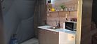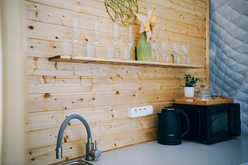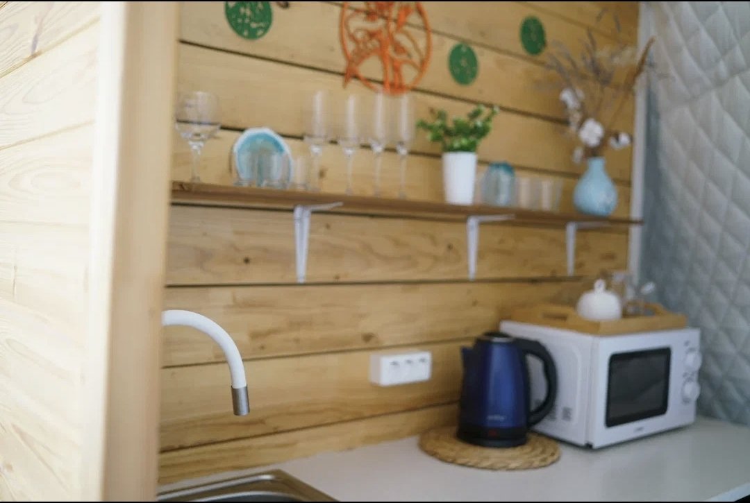 В домике есть всё необходимое для проживания: кухня, собственная ванная комната.