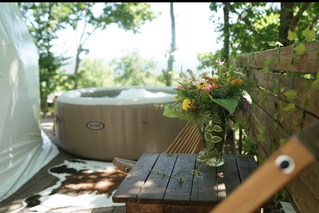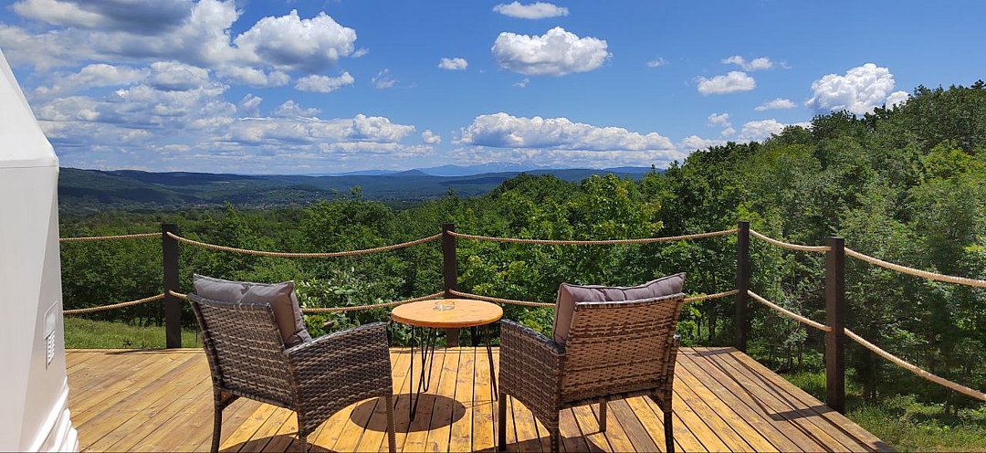 У сферы есть собственная деревянная терраса с видом на горы и лес, креслами кентукки, мангальной зоной.