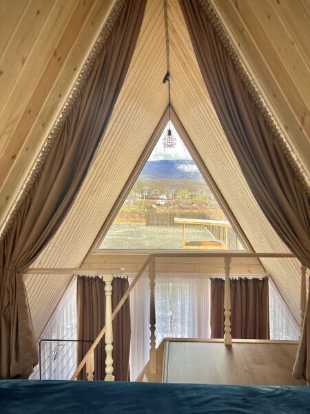 На территории расположен отдельный двухэтажный дом А-frame, который может вместить до 4 гостей. На первом этаже находится: кухня, гостиная с раскладным диваном и санузел. Ha втором этаже находится спальня.