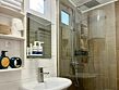 Ванная комната с душевой кабиной и косметическими принадлежностями.