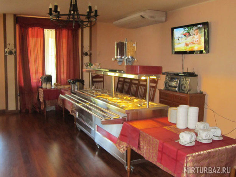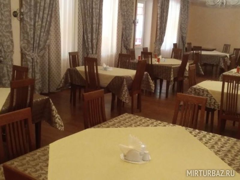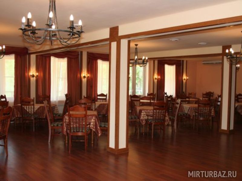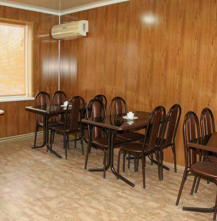 Обеденный зал: 3 стола, 12 стульев, кондиционер, ларь морозильный, холодильник, микроволновая печь, термопот