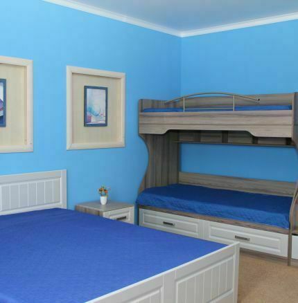 В номере: прихожая, шкаф, туалетная комната с душевой кабиной, кондиционер, плазменный телевизор, спутниковое ТВ. Спальня: 1 двухместная кровать 2,0х1,6 м., двух-ярусная кровать 1,97х0,84 м., 2 прикроватные тумбочки, комод.
