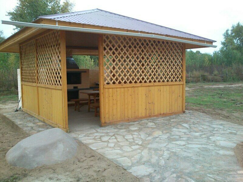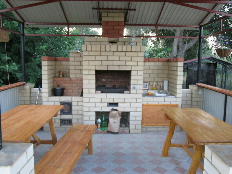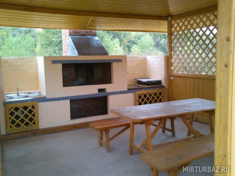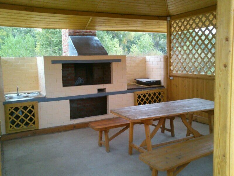 - веранда: газовые плиты, стол разделочный, лари морозильные, стол, лавочки;