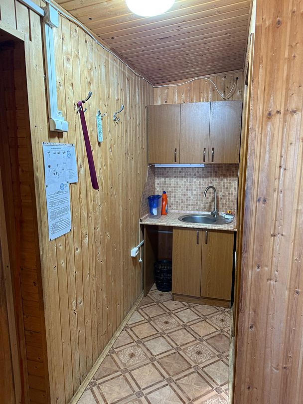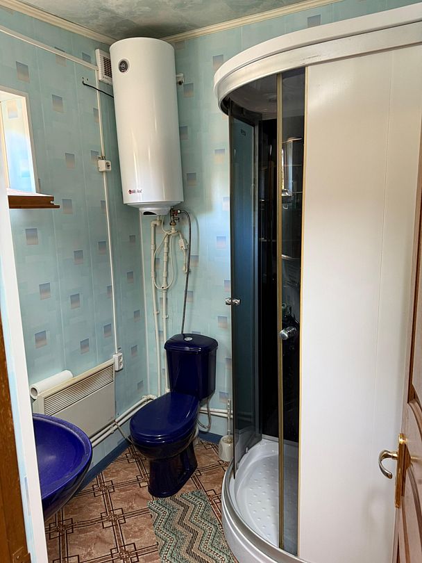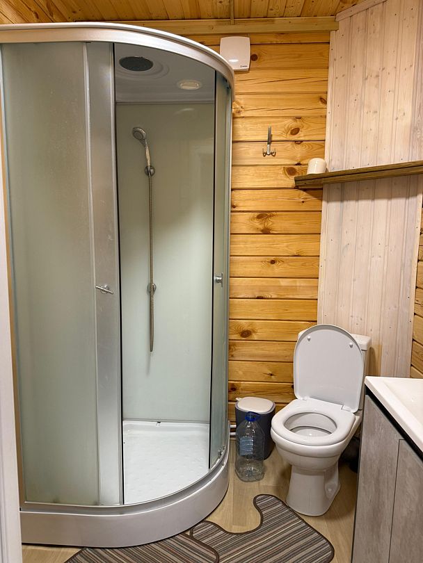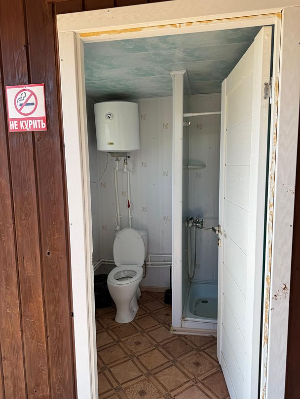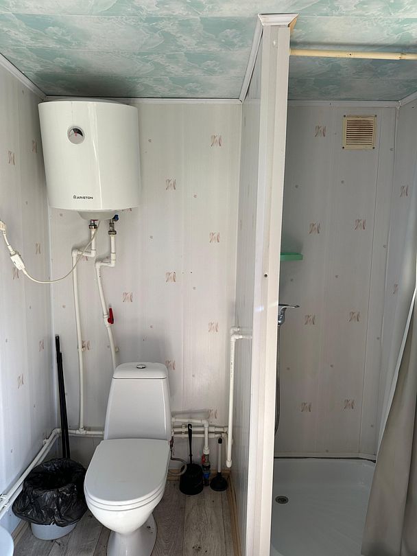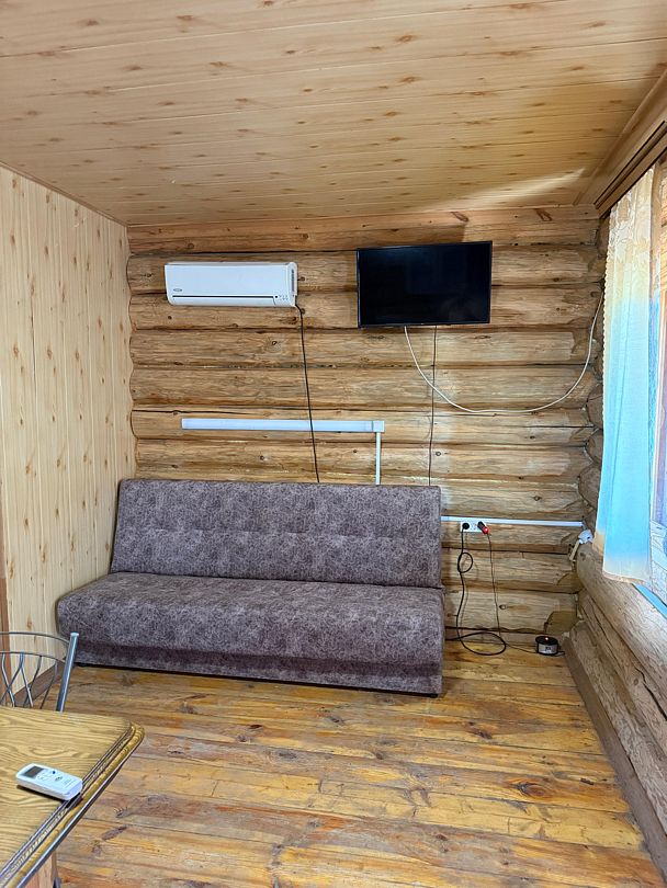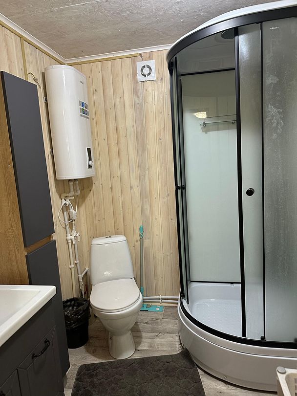 Размер 6х6 метров, веранда 6х2 метра. Сплит-система, умывальник, душевая кабина, унитаз. Общая комната.
