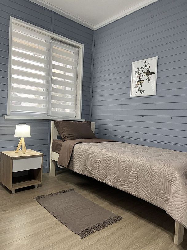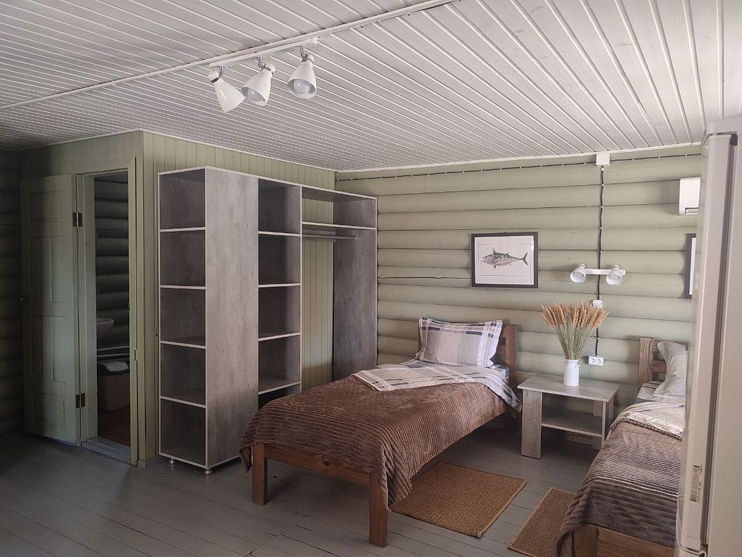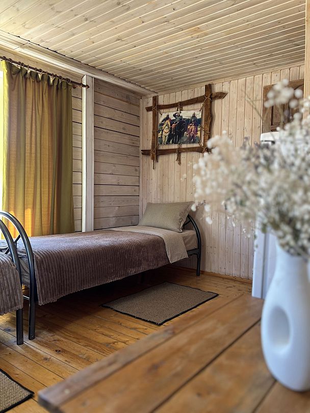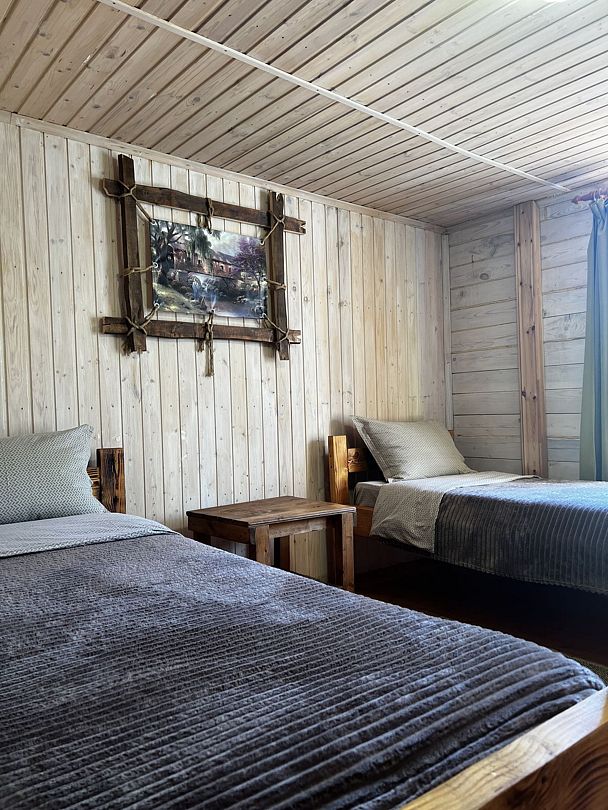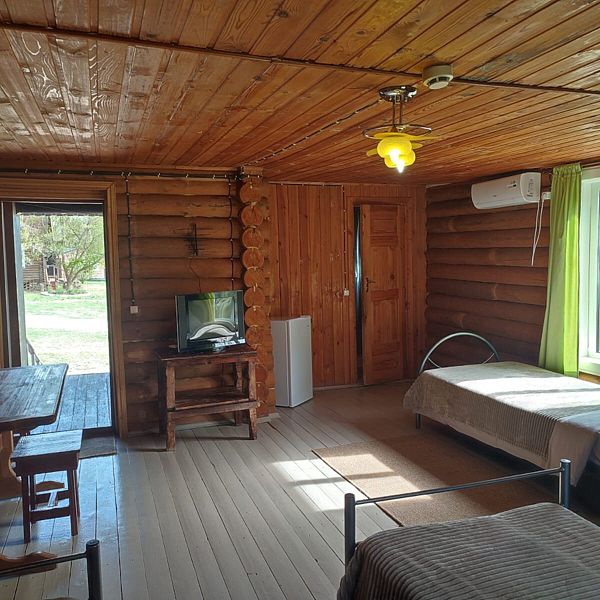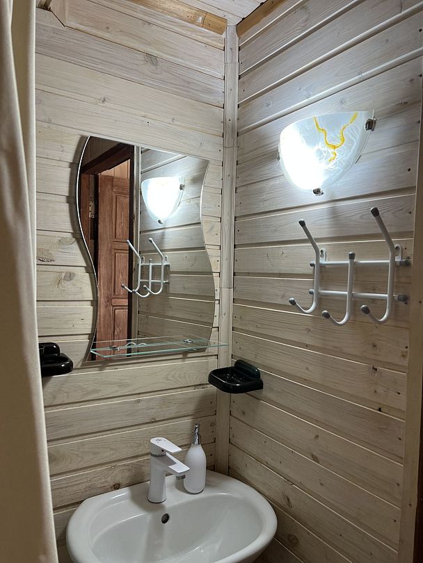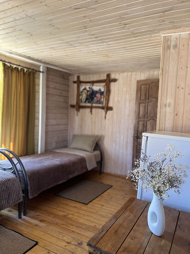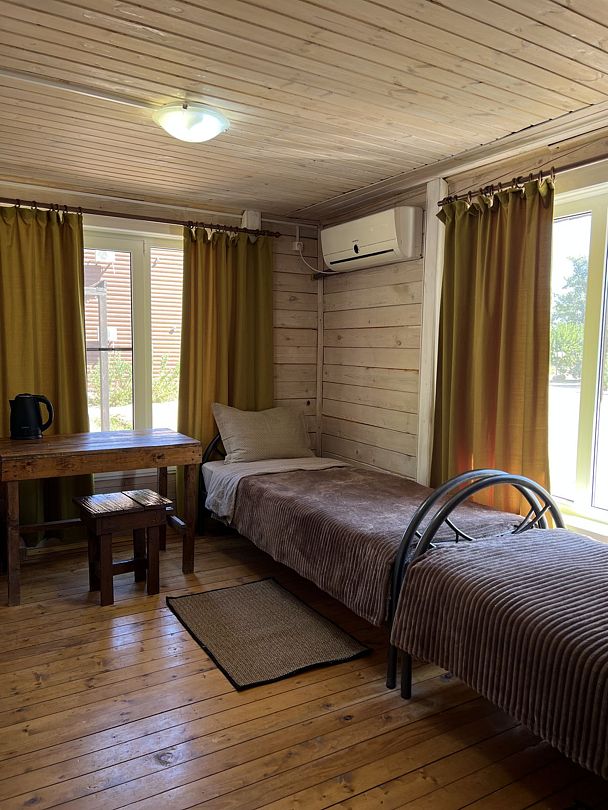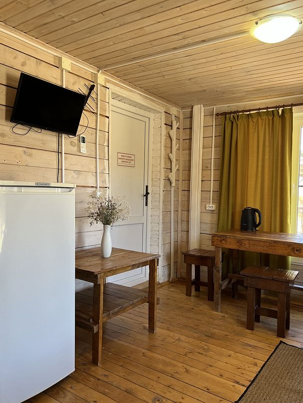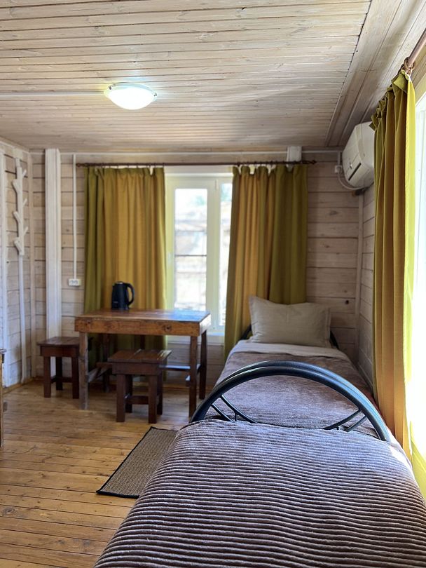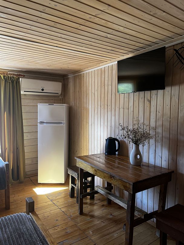 Деревянный, отдельно стоящий коттеджи со всеми удобствами (душ, туалет, кондиционер, телевизор, холодильник). На 1 этаже спальня и на 2 этаже.