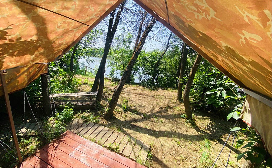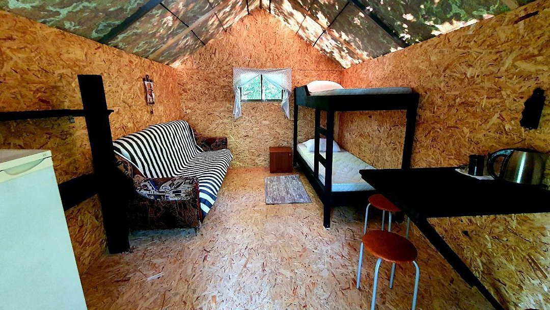 Можно арендовать палатку на базе отдыха с кроватями или матрасами и холодильником (дополнительно оплачивается).