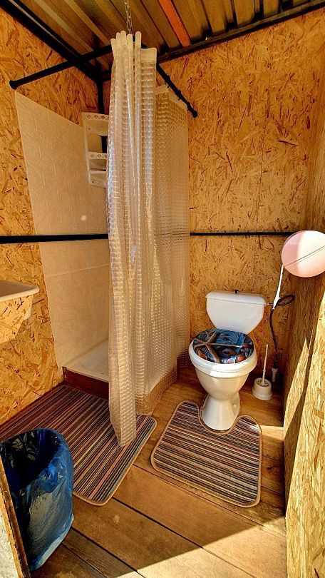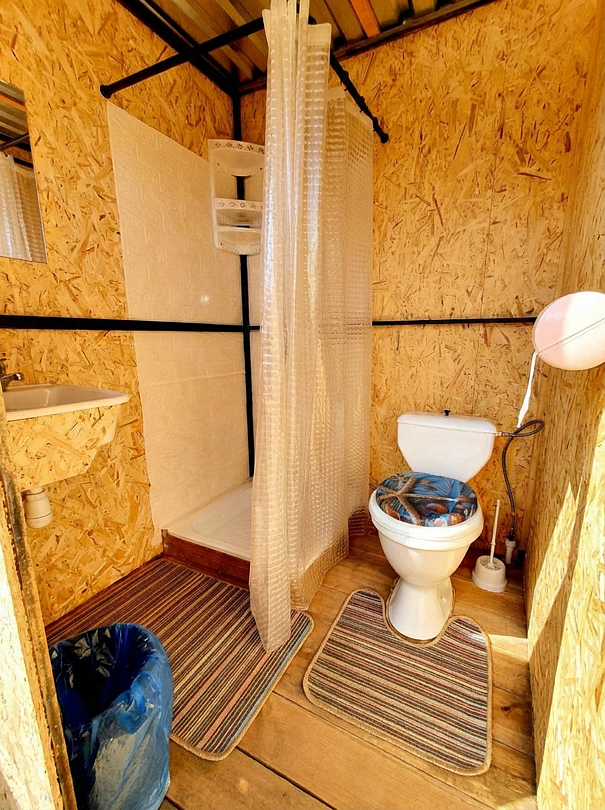 Туалет и душ с горячей водой (у каждого домика свой, на улице в шаговой доступности).