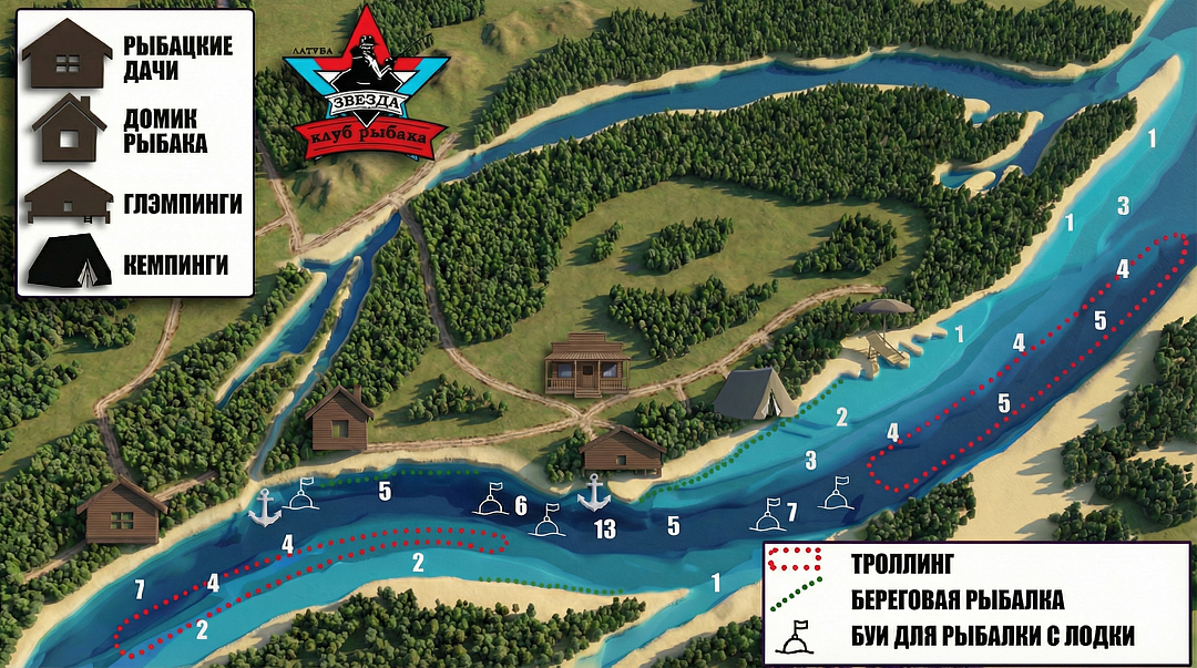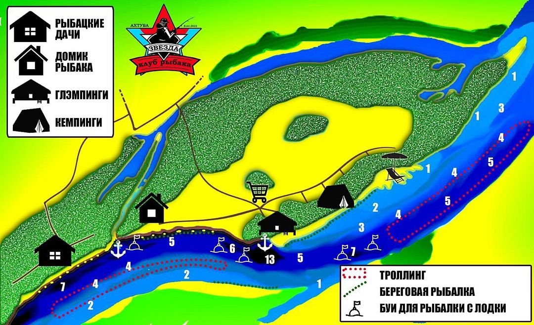 На территории предоставляется 25 секторов для рыбалки. Береговая линия простирается на 2,5 километра от большого яра до песчаных плёс, что удовлетворит все потребности рыбаков.