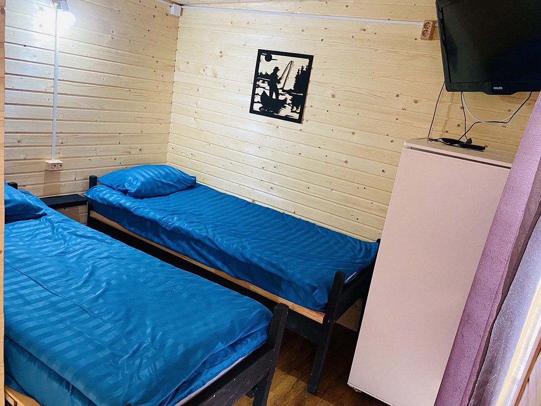 В домике душ с туалетом, большая двухъярусная кровать с удобными матрасами, раскладной диван. Холодильник, телевизор, электрический чайник и столовая посуда, постельное бельё и полотенца.