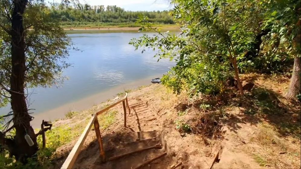 Инфраструктура для рыбака: Личный спуск к воде (крутой, около 12 ступеней) и причал для лодки, а также столик для чистки рыбы.