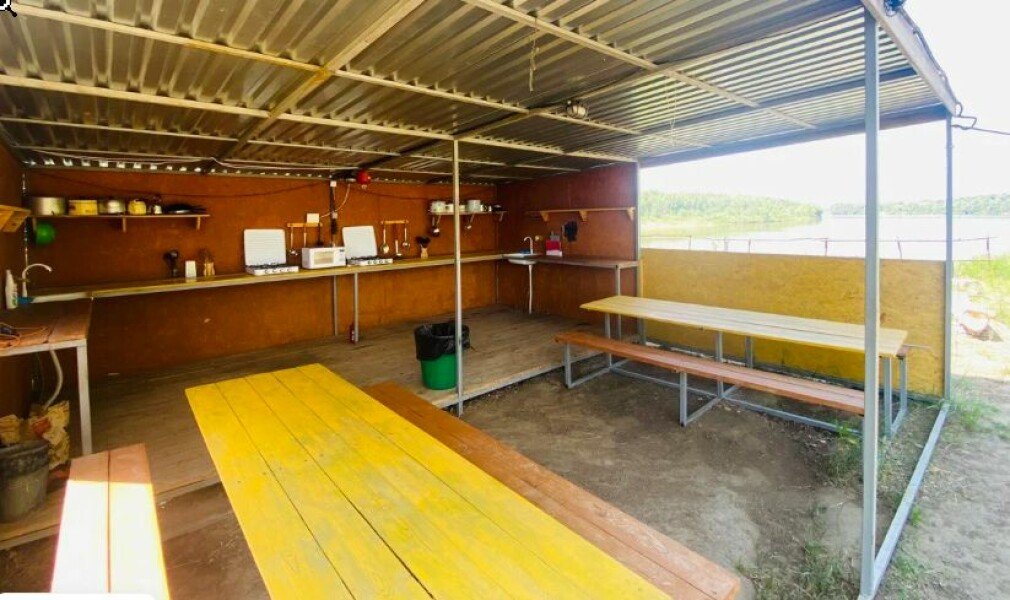 Настоящее сердце комплекса это мангальная на берегу: Просторная территория с зоной отдыха несколькими мангалами, казанами и зоной барбекю. Хватит места всем, чтобы готовить, общаться и делиться впечатлениями о пойманных трофеях.