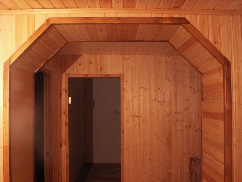 Гостиная - стол, 5 стула, электрочайник, холодильник, морозильный ларь, обогреватель, спутниковый ТВ и комплект посуды на 5 человека.